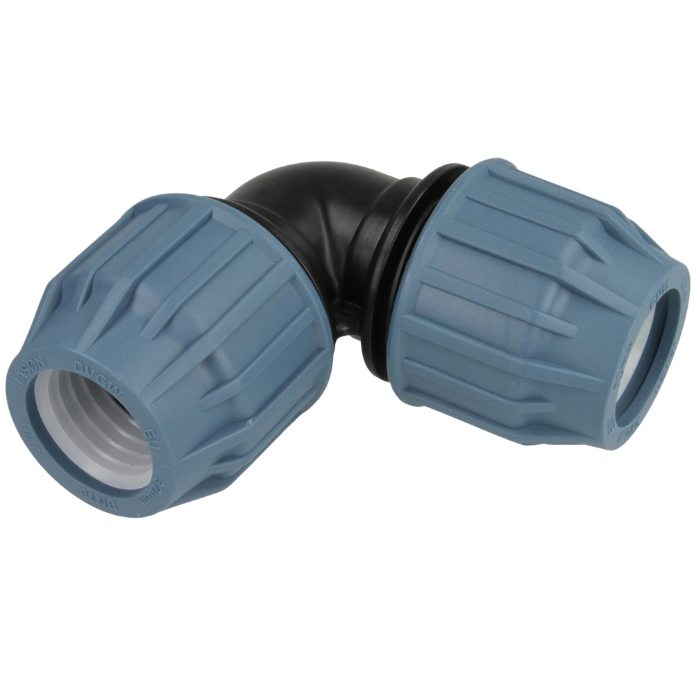 PE elbow compression fitting for compression joints of PE pipes on both ends in a 90° angle.