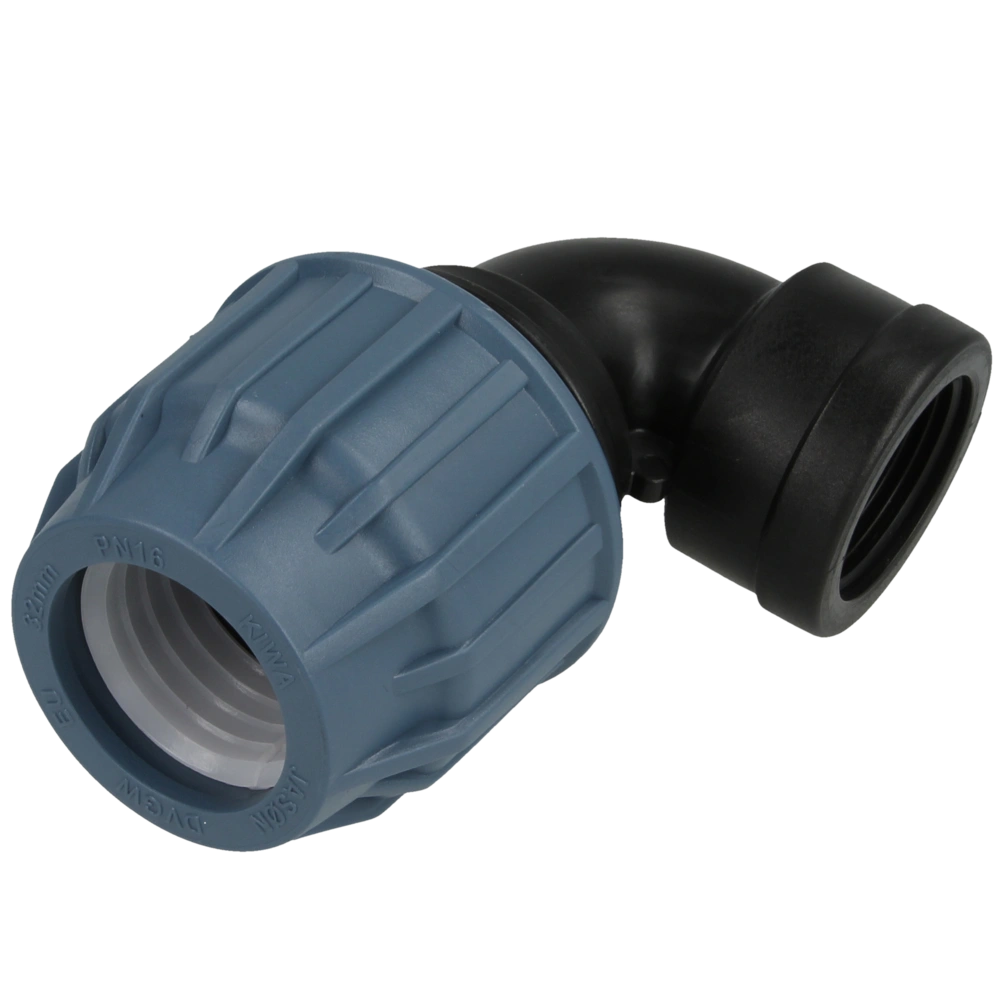 PE elbow compression fitting with female thread for PE pipe joints in a 90° angle.