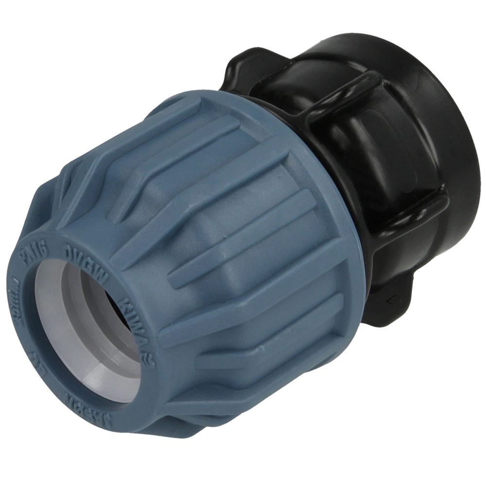 PE compression fitting adaptor with female thread for jointing PE pipes.
