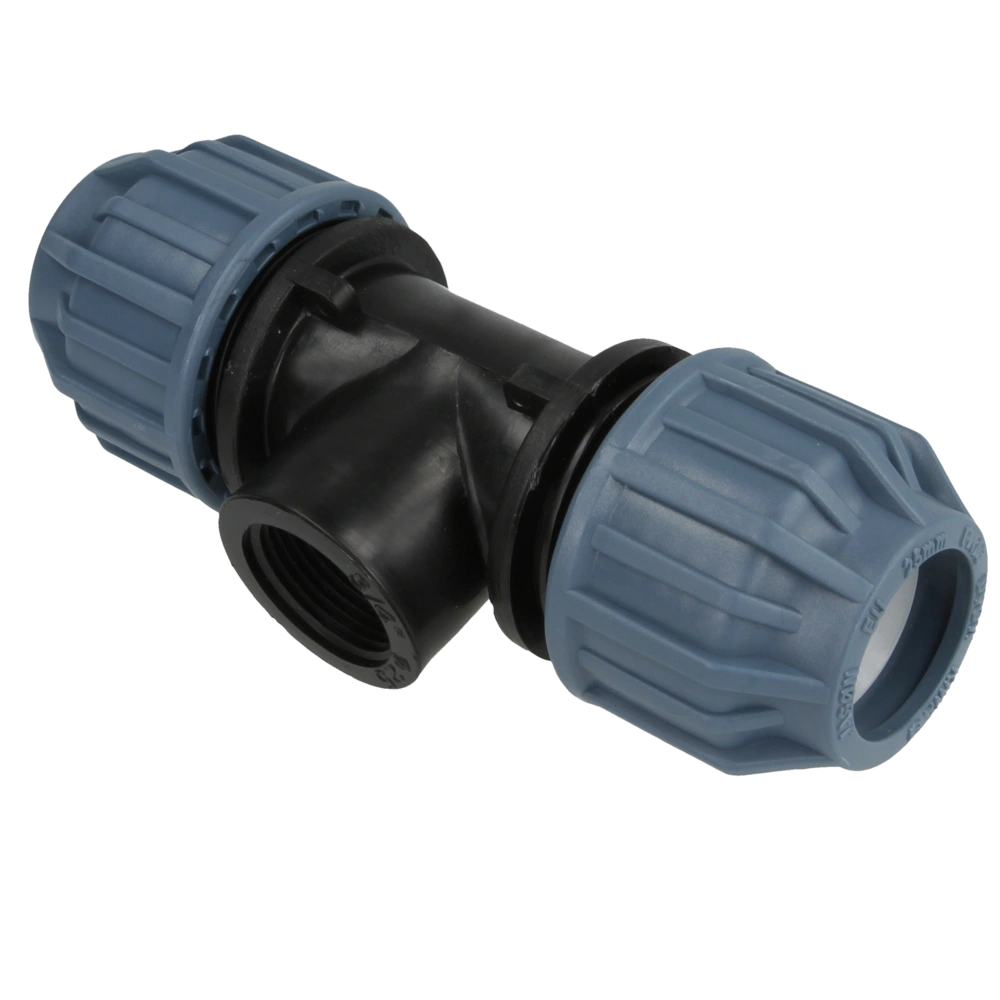 PE compression fitting tee with 2-sided compression connection and a connection with female thread for PE pipe joints.