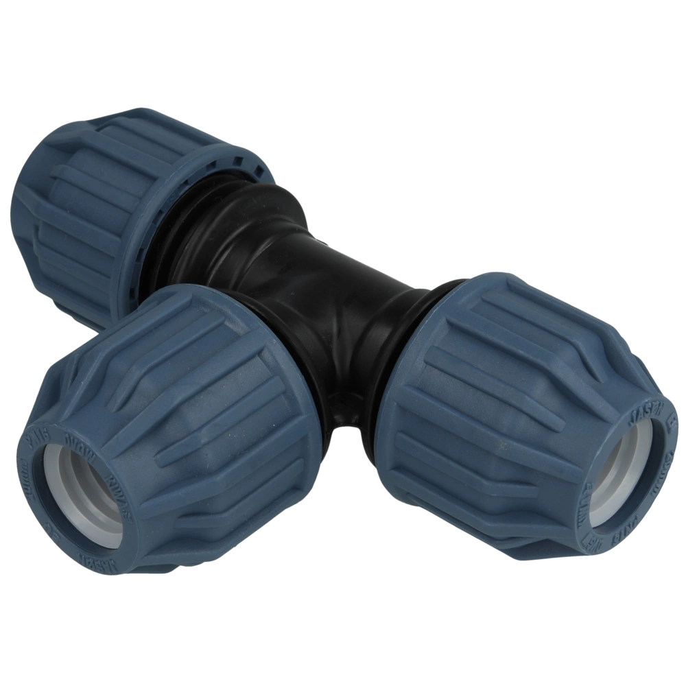PE compression tee for jointing PE pipes on three ends.
