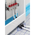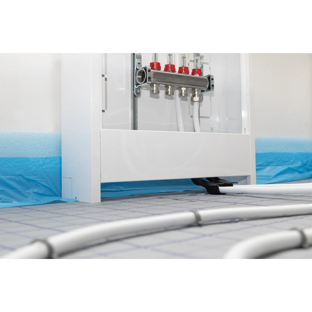 Plastic bend for safe and damage-free deflection of the heating pipe when being led to the manifold, in case of ceiling break-throughs and other deflections with 90° angles.