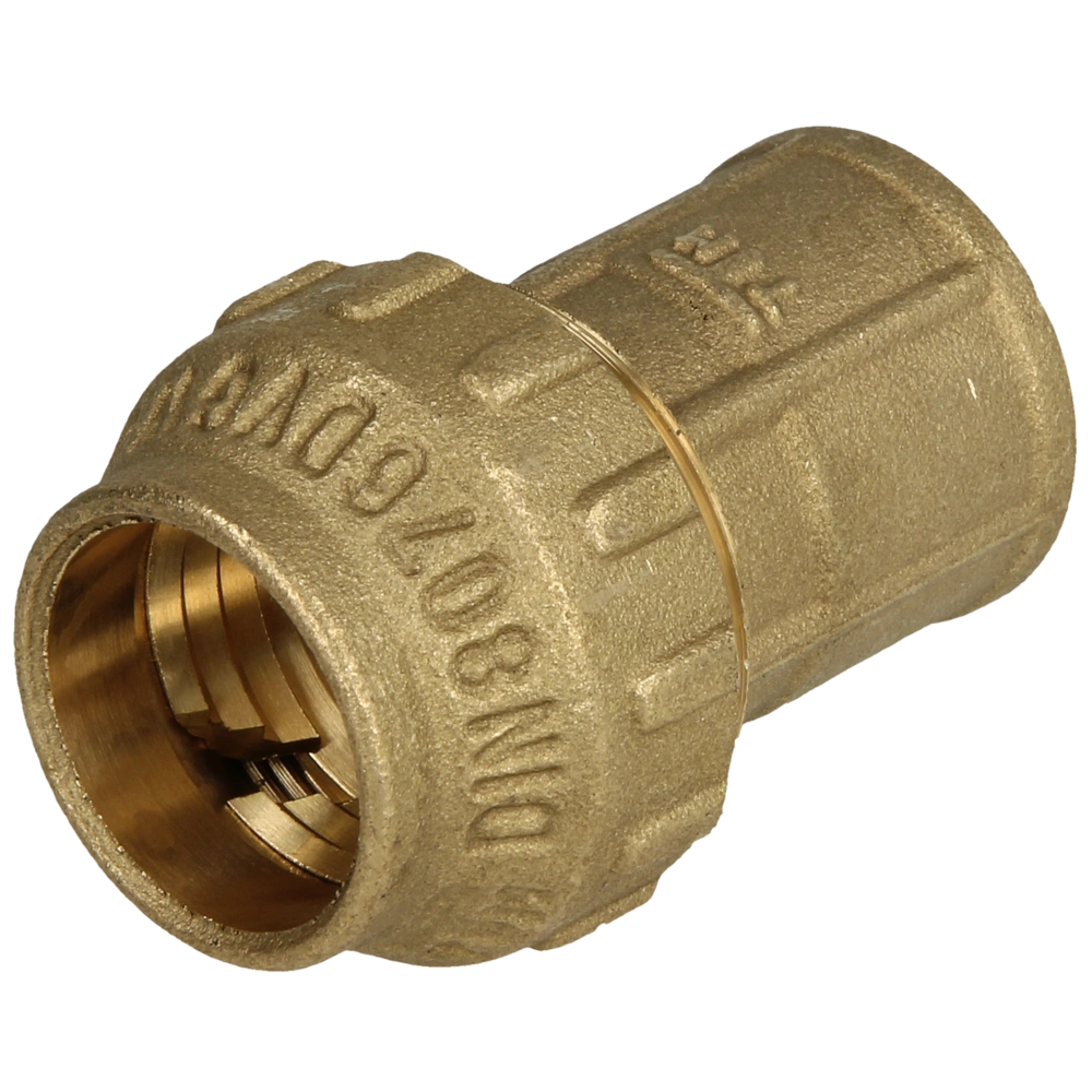 Brass compression fitting with brass compression ring for the connection of PE pipes in drinking water installations.