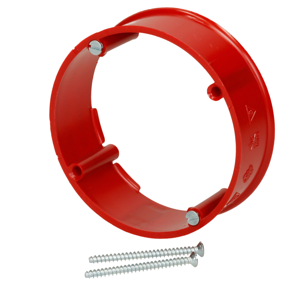 Plaster compensation ring for levelling recessed junction boxes and maintaining the specified IP rating. The compensation ring is equipped with 2 screwed-in device screws and 2 ring fastening screws.