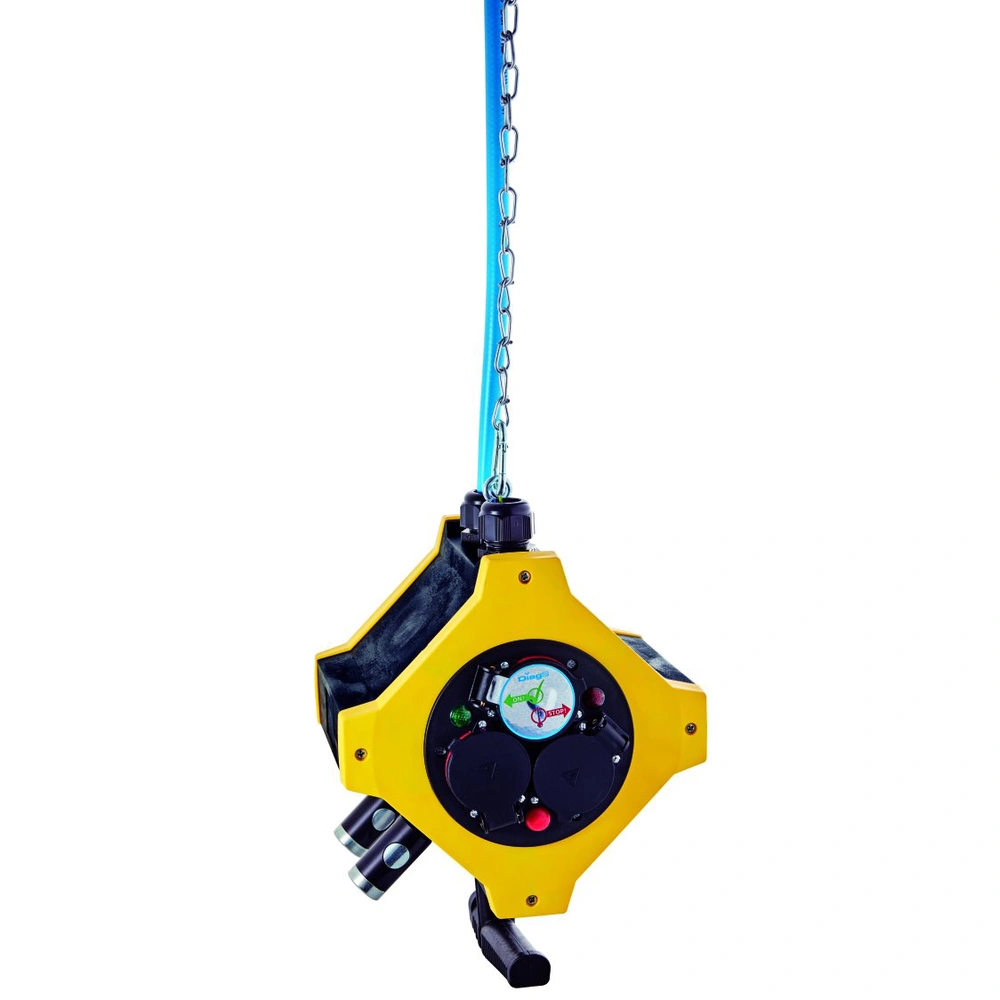 The galvanised suspension chain relieves the connection hose and connection cable (cable and chain 2 metres each). The integrated thermal fuse automatically switches off in the event of overheating. There are 3 shockproof sockets each on front and back.