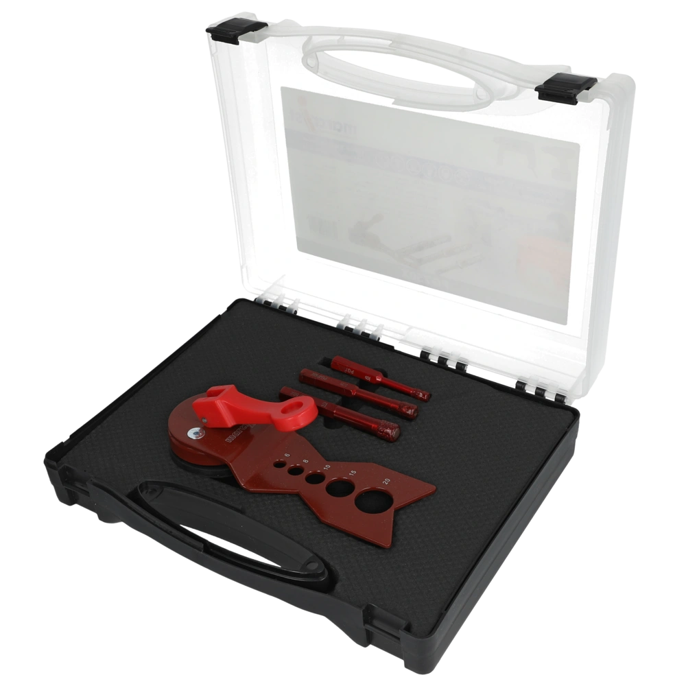 Diamond tile drills in a set of 3 plus drilling template for professional dry drilling of tiles, porcelain, mosaic tiles and hard granite. The drill is durable and extremely fast. The drilling template prevents slipping when you start drilling...