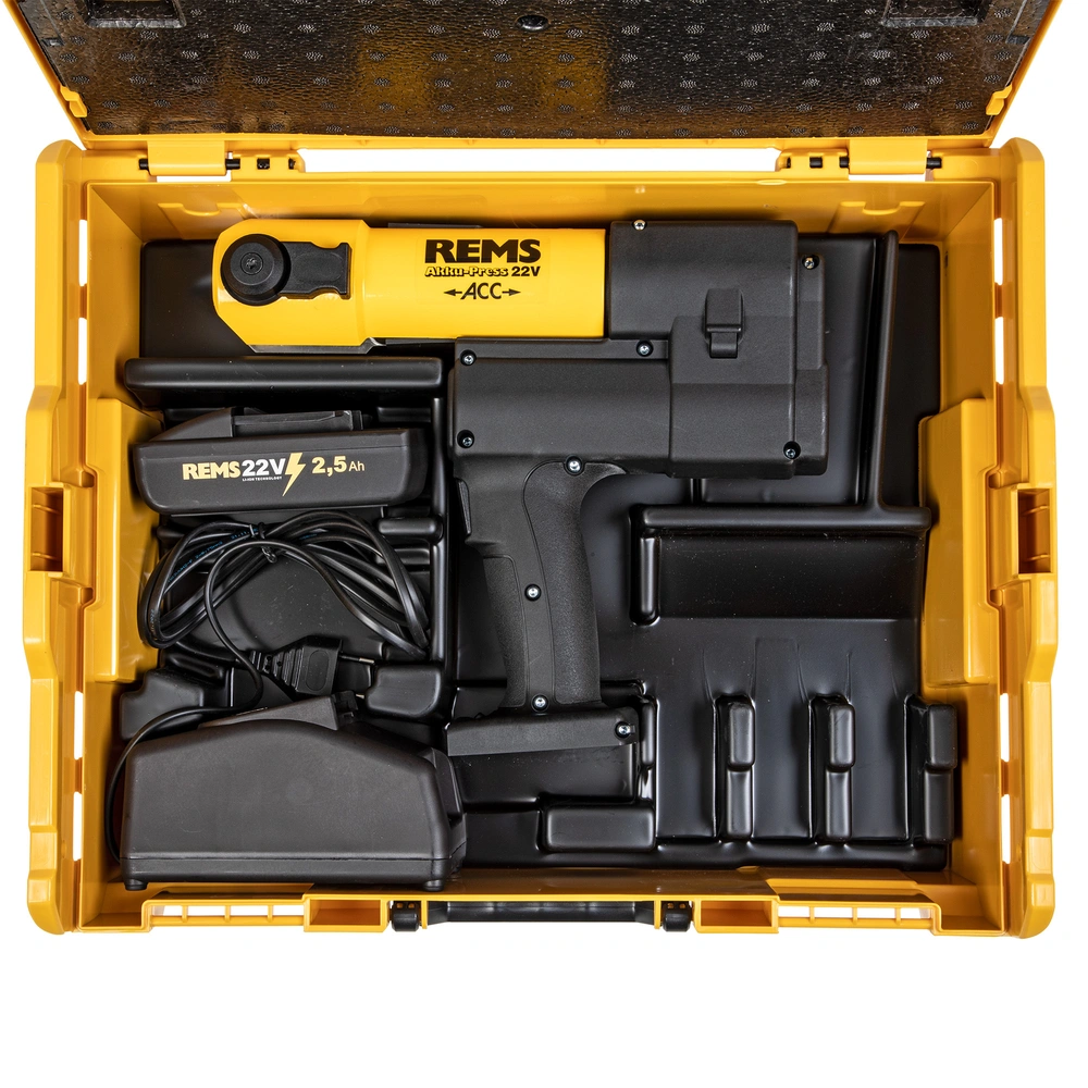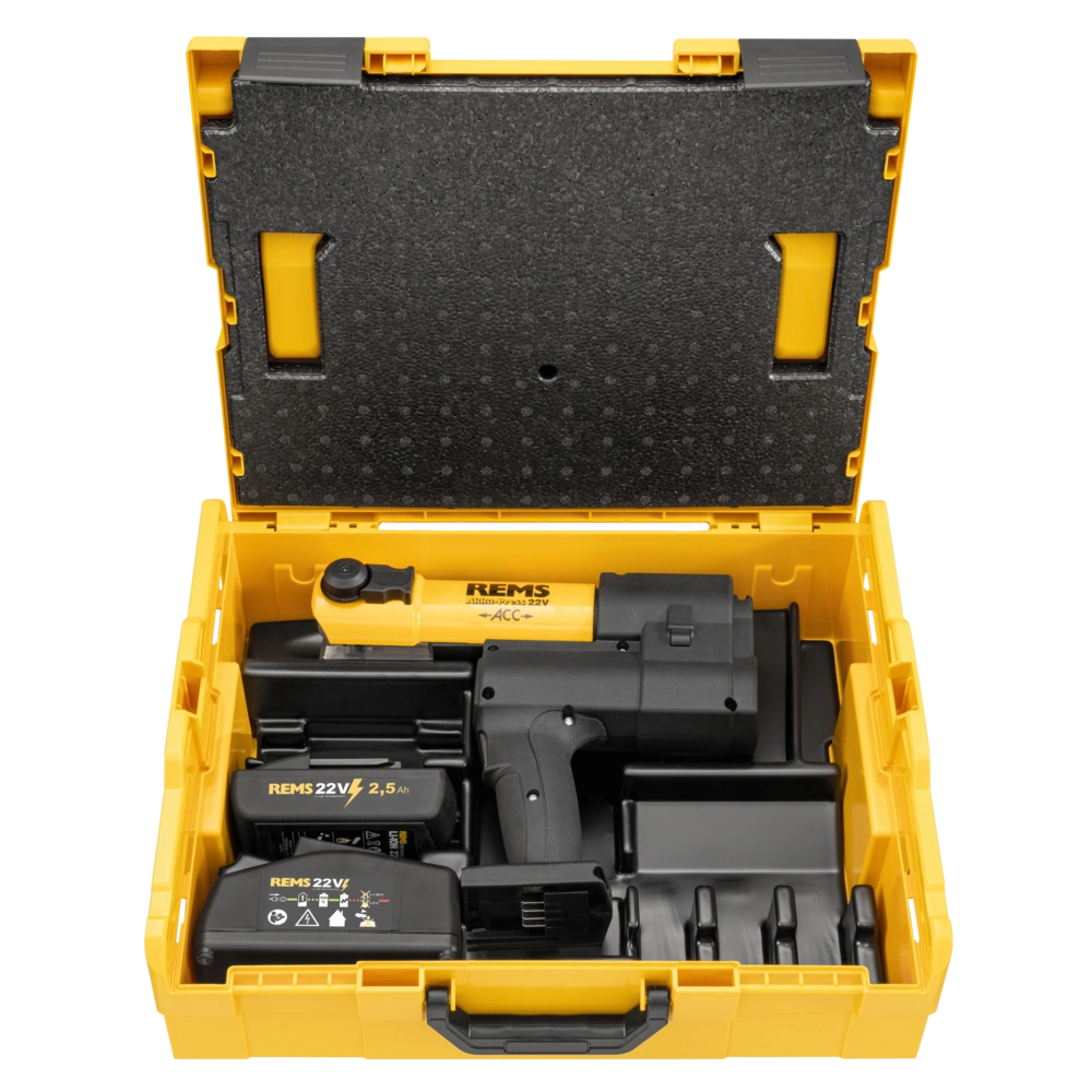 A safety inching switch protects against fault pressings or injuries, and the compact high-performance hydraulic system enables strong pressing in confined spaces. An integrated LED work light illuminates the work area. In addition to the practical L-Boxx, a battery and a quick charger are also supplied.