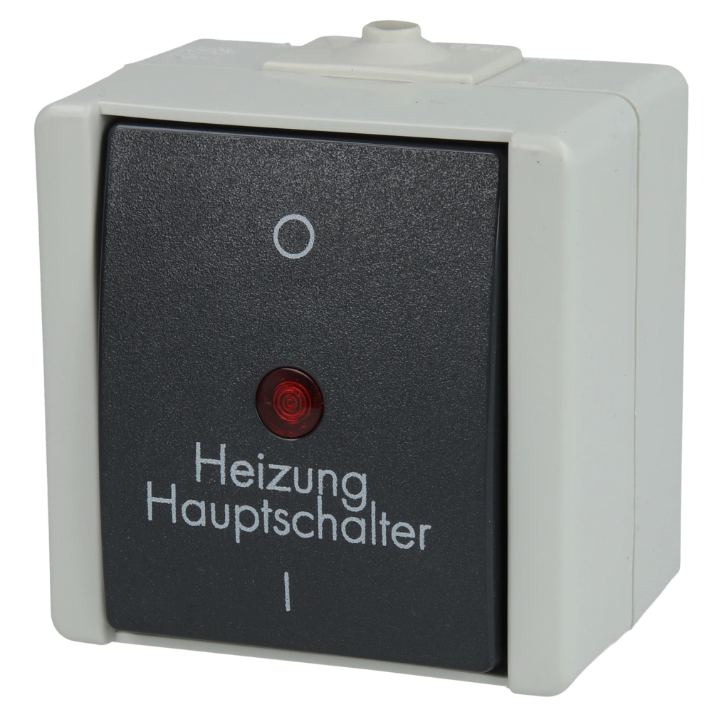 The heating main switch is suitable for damp rooms. The rocker has a labelling. The switch is also equipped with a glow lamp below the lens.