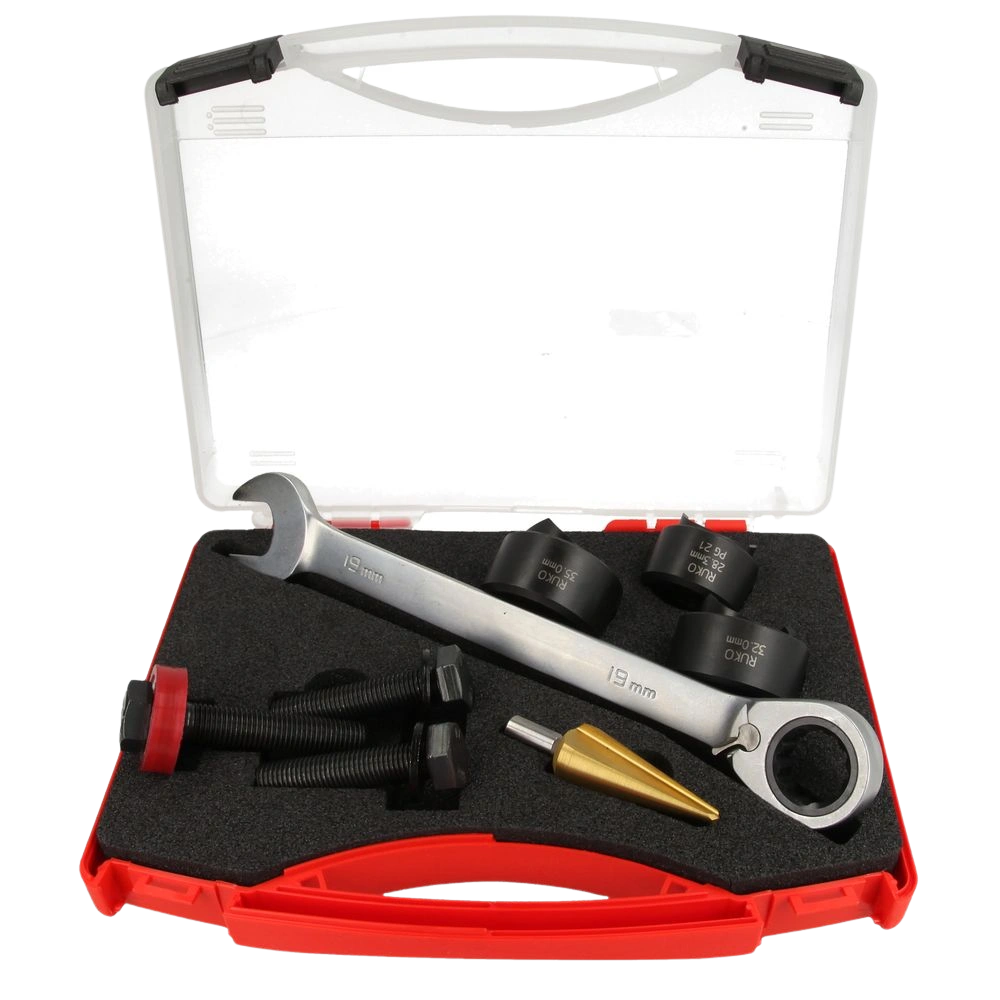 All product information Scope of deliveryProfessional screw-hole punch set supplied in a practical plastic case for plumbing tasks.