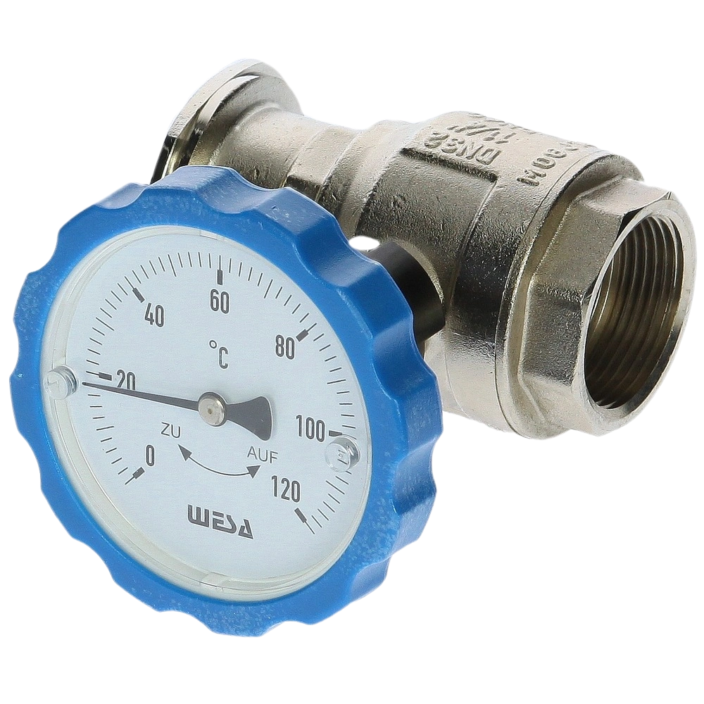 Pump ball valve for 2" union nut with thermometer for the connection of a DN32 circulation pump.