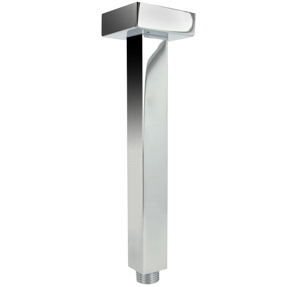 Shower arm and rosette in angular shape made of chrome-plated brass for ceiling mounting.