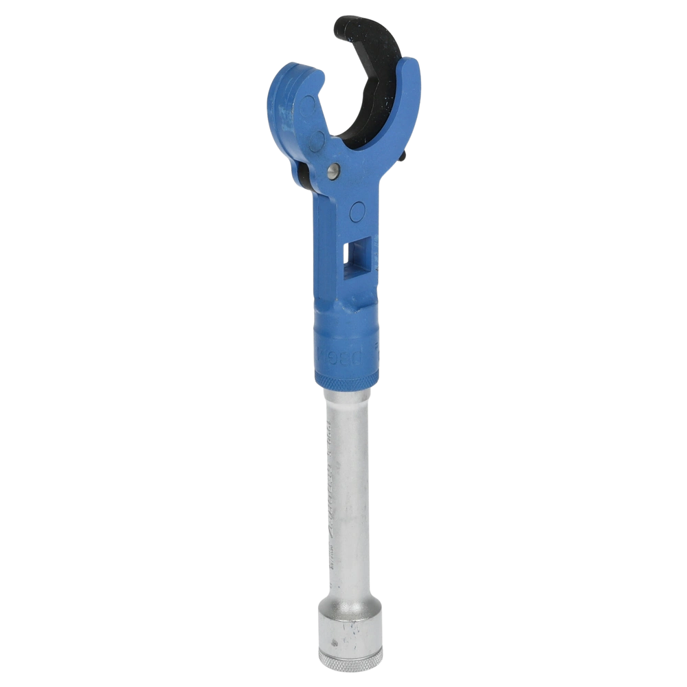 Spanner with ratchet function for tightening and removing Euro-cone radiator compression fittings with cam lock and hex nuts. The head-side mounting option for an extension with 1/2" square serves as a handle and at the same time provides a higher torque. With lateral mounting possibility for a 1/2" extension you can work with a ratchet or screw in radiator valve nipples with a combination stepped key.