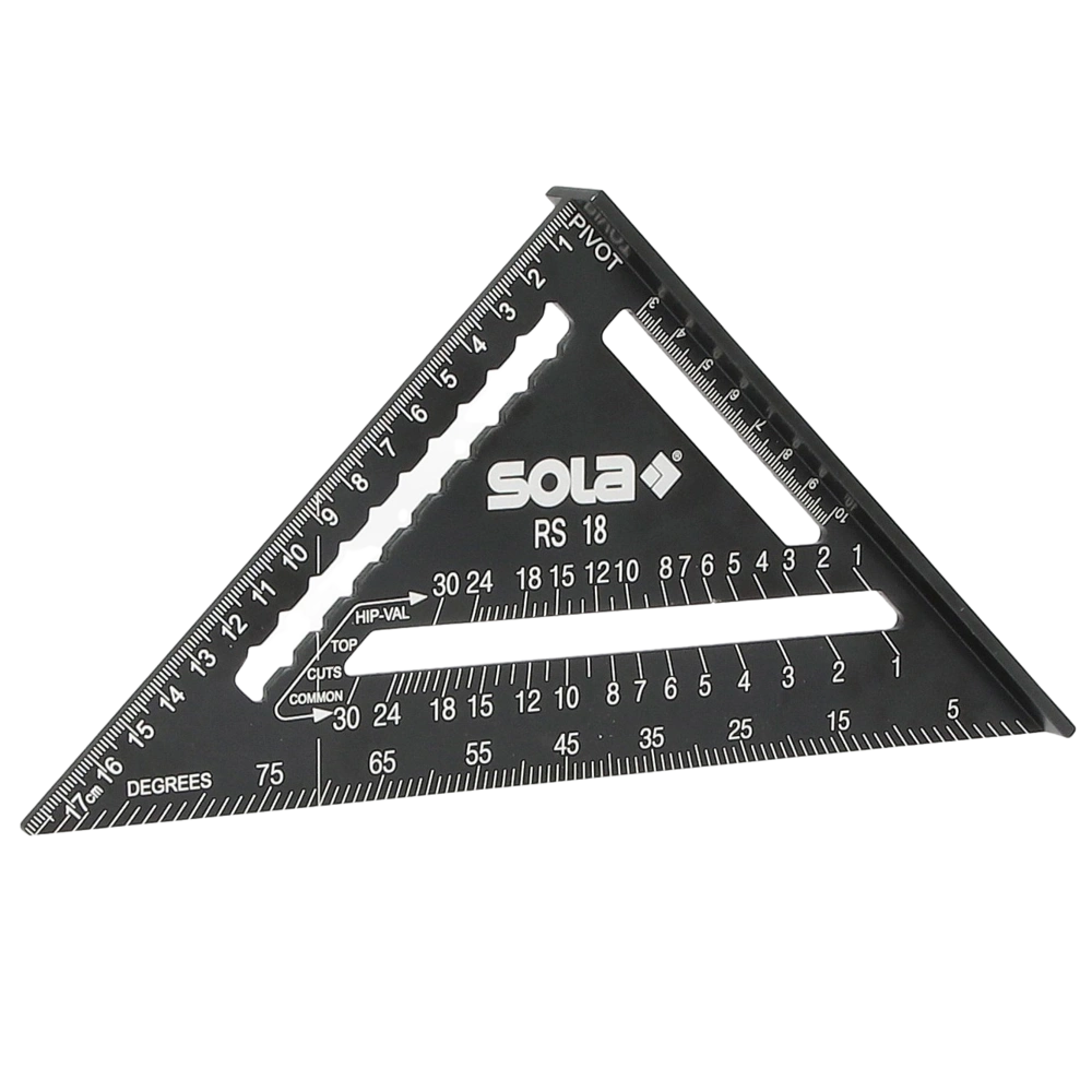 Multi-functional rafter square made of coated aluminium for numerous applications. Due to its different scales and recesses, the protractor is suitable for the measurement of the rise or the angle of common, hip, valley and jack rafters...