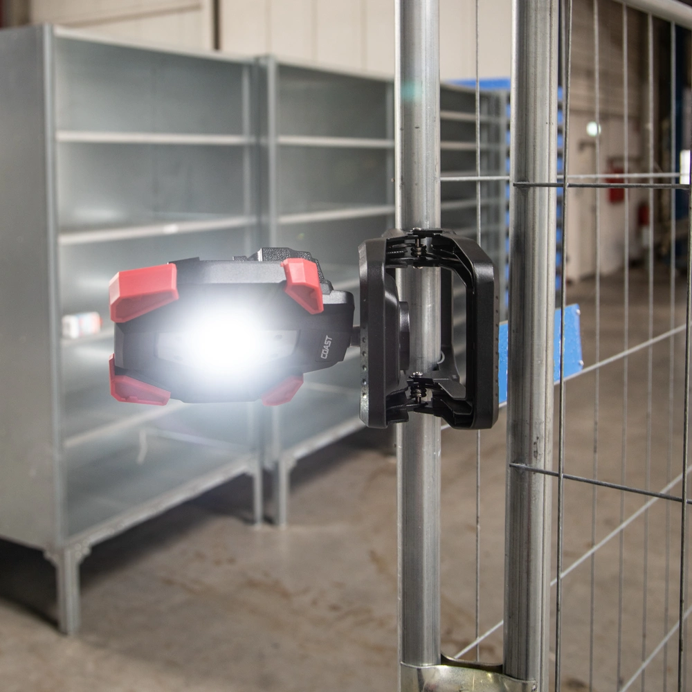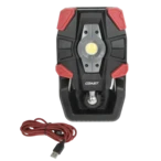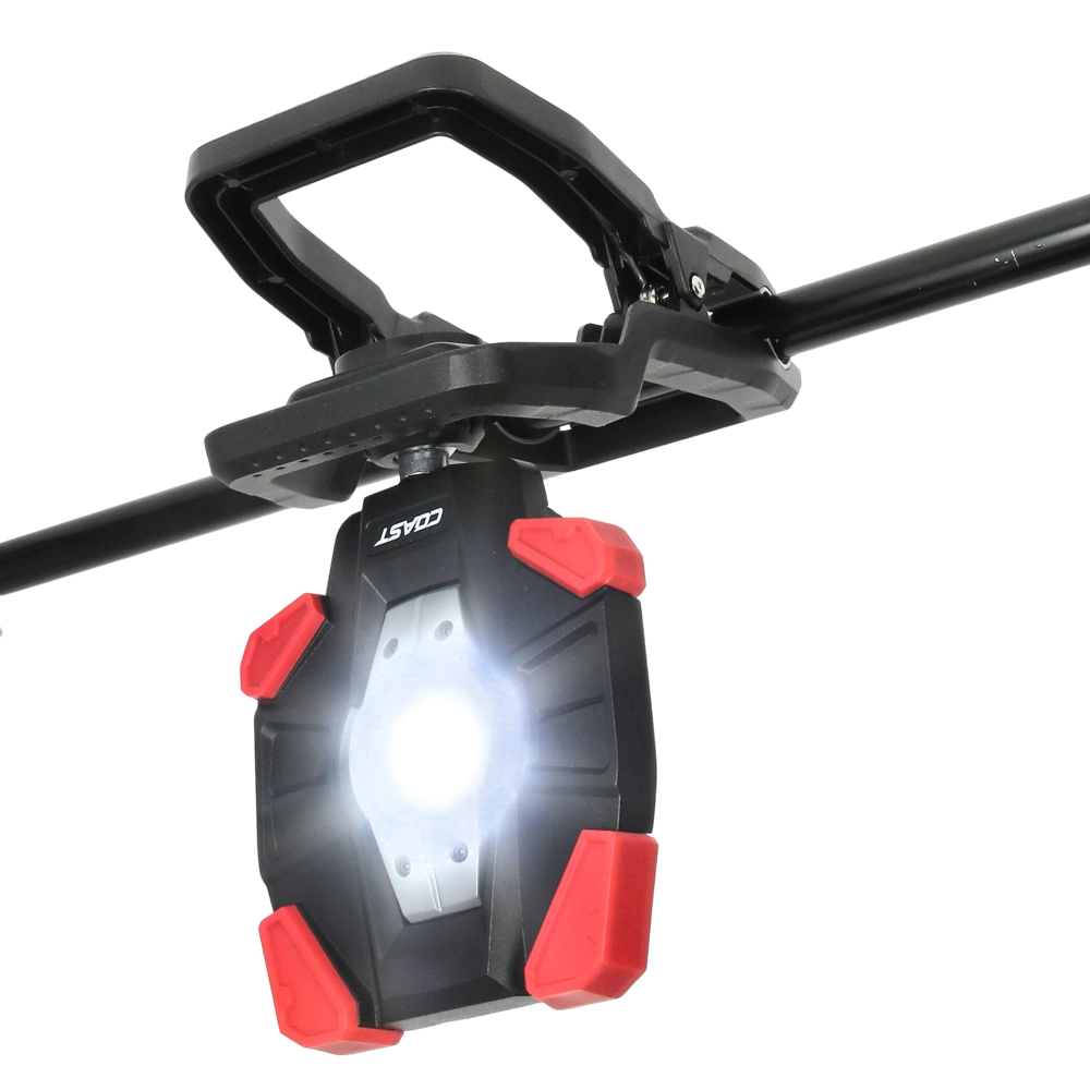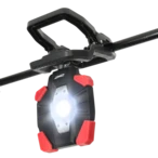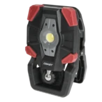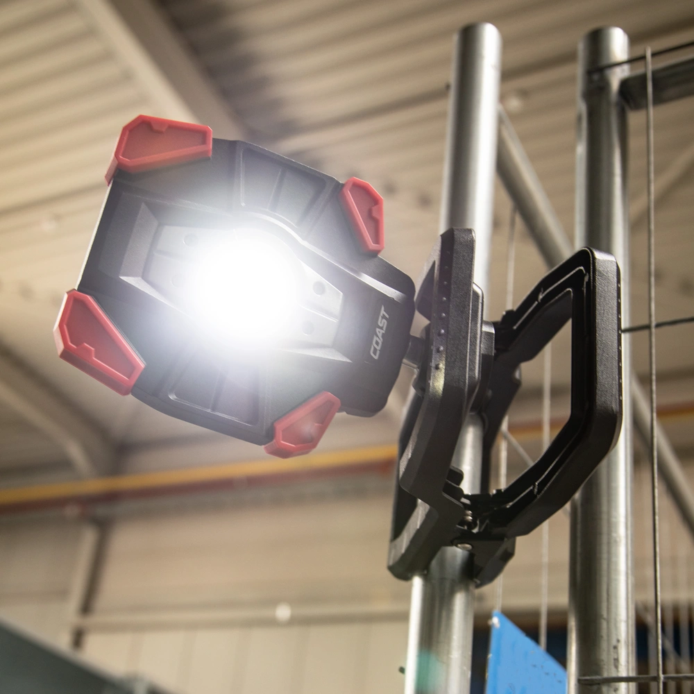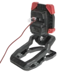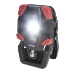 Rechargeable work luminaire with wide angle flood beam in 3 brightness settings and with clamp attachment.
