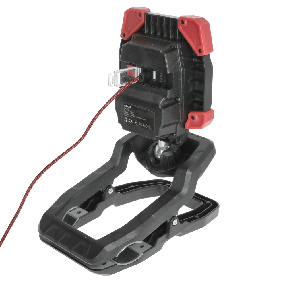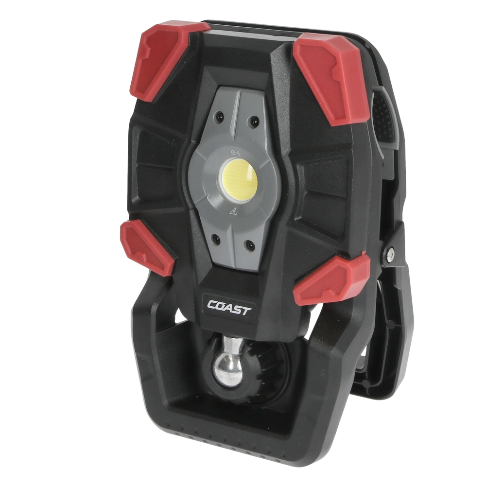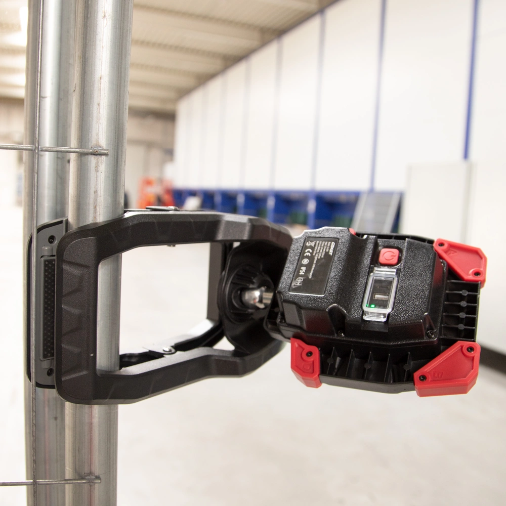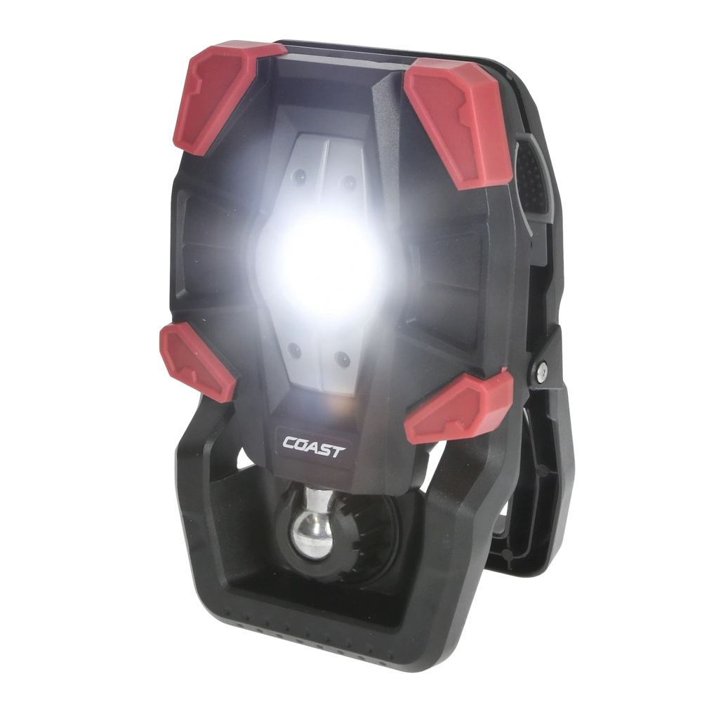 Rechargeable work luminaire with wide angle flood beam in 3 brightness settings and with clamp attachment.