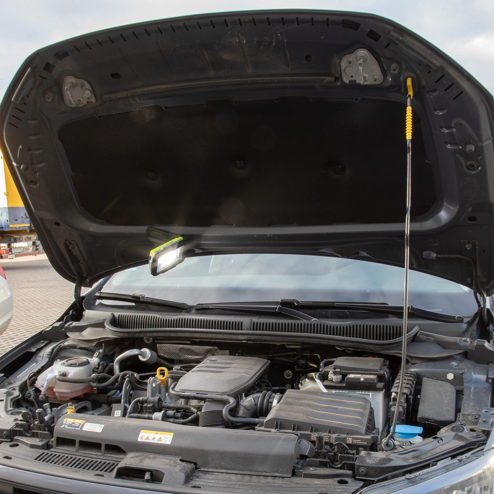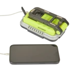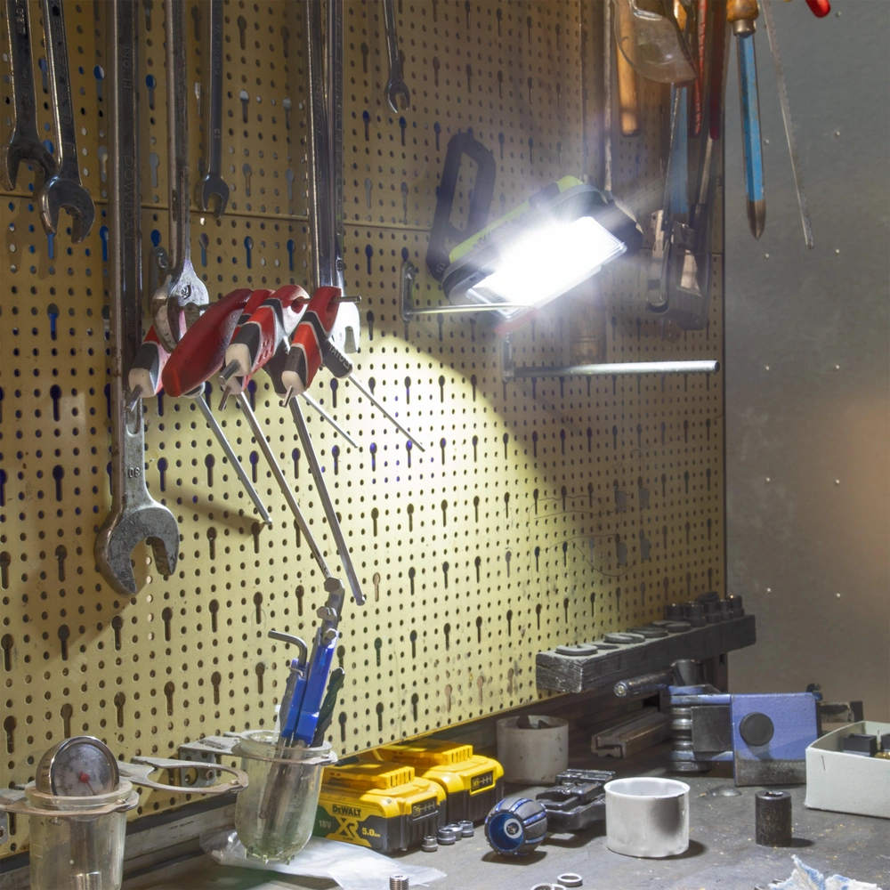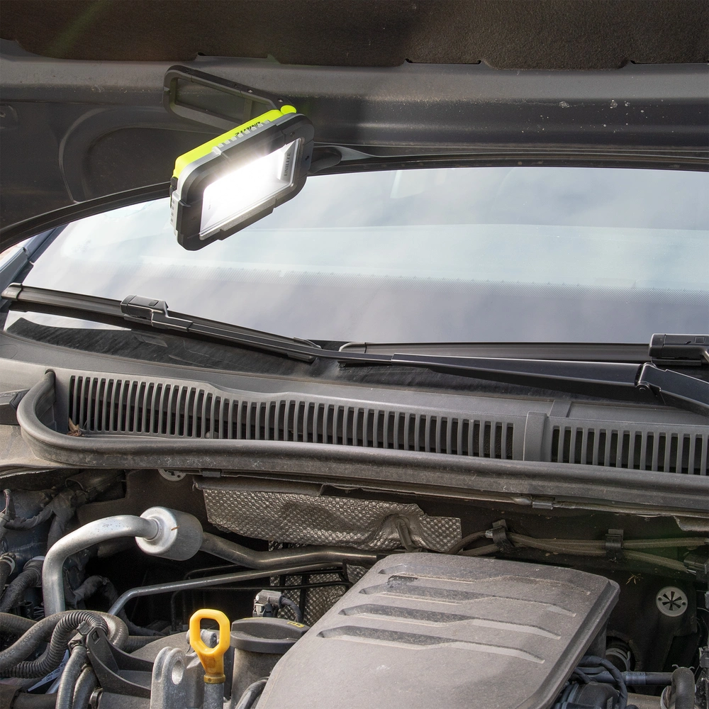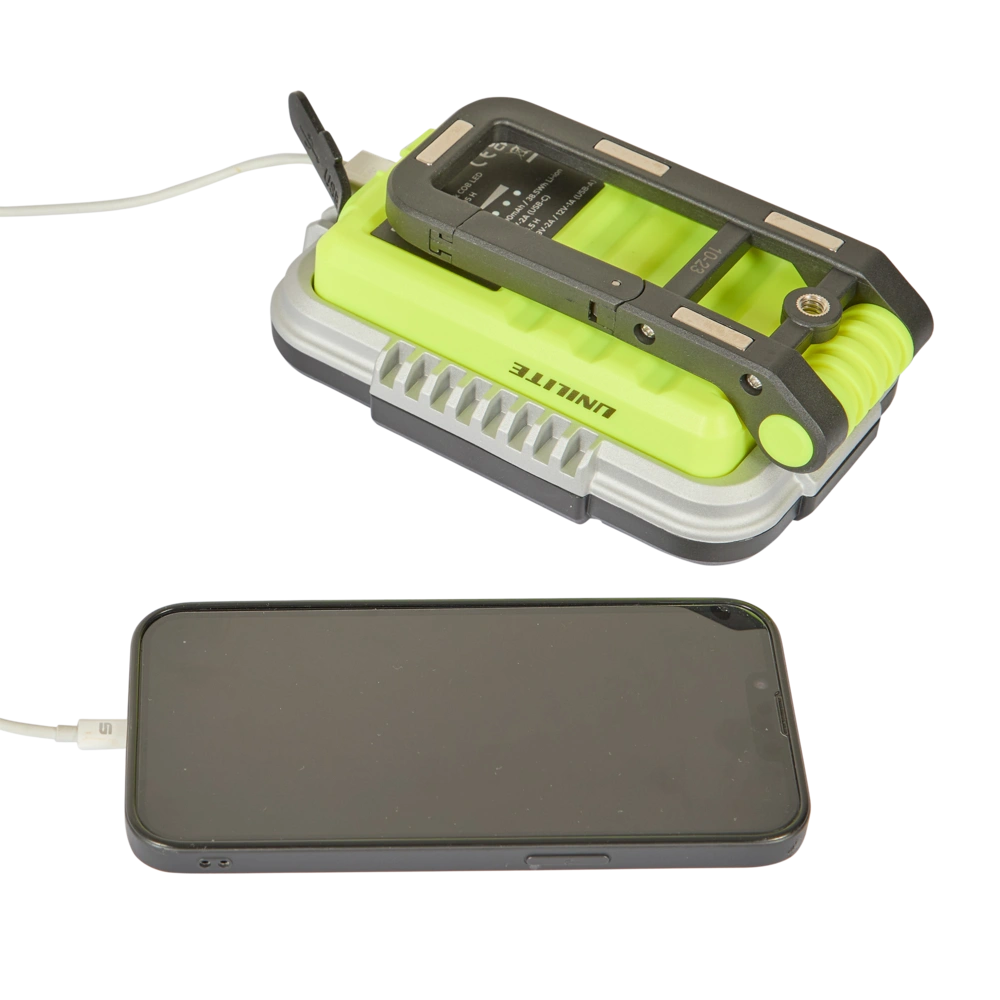 Rechargeable work light with integrated USB powerbank for charging smaller devices. The waterproof luminaire has a robust housing with a handle foldable by 180° and fitted with a convenient snap hook and strong magnets...