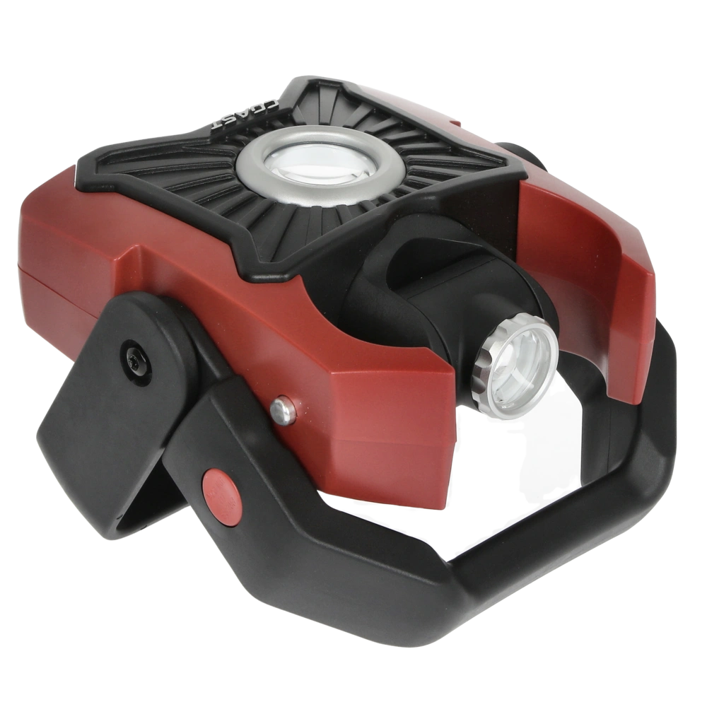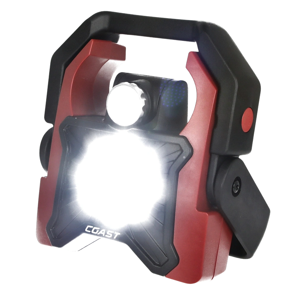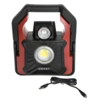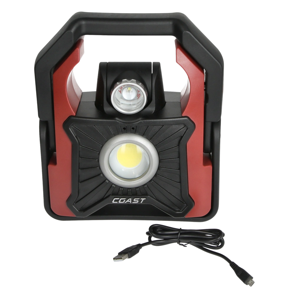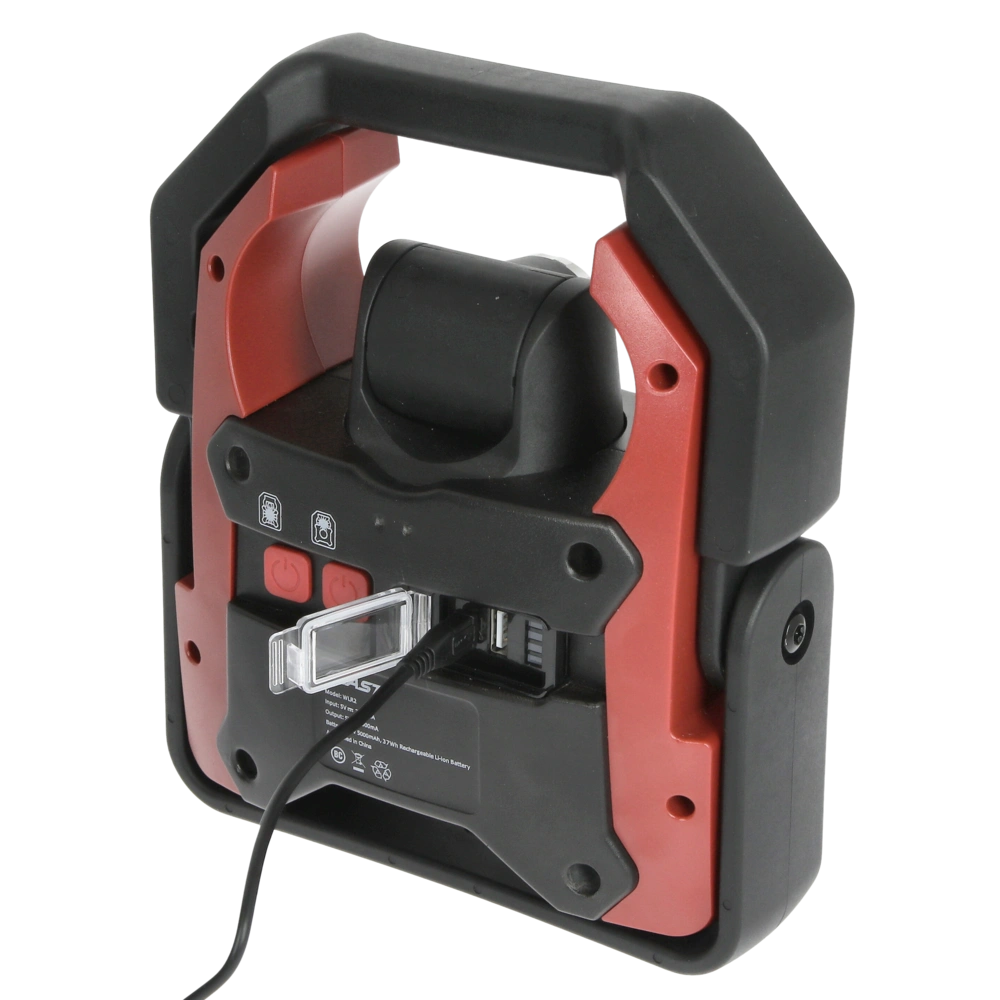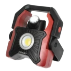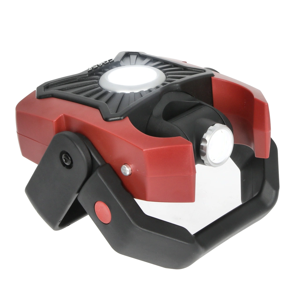Rechargeable work light with wide-angle flood beam and spot beam. The handle also serves as stand and allows for flexible adjustment of the dust- and splash-proof light. A tripod holder is integrated. The beam can be zoomed in by turning the swivelling spot beam by 180°. The light can also be used as powerbank for external devices.