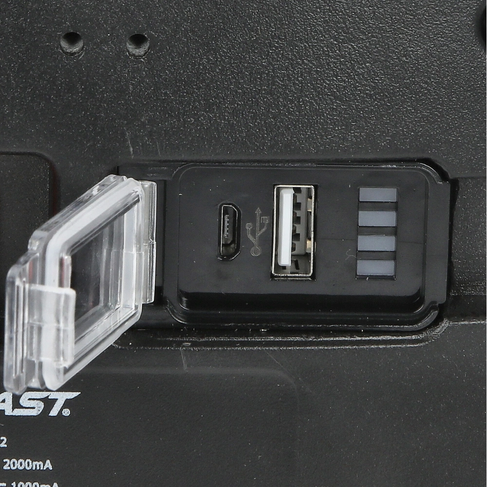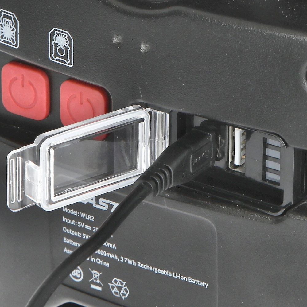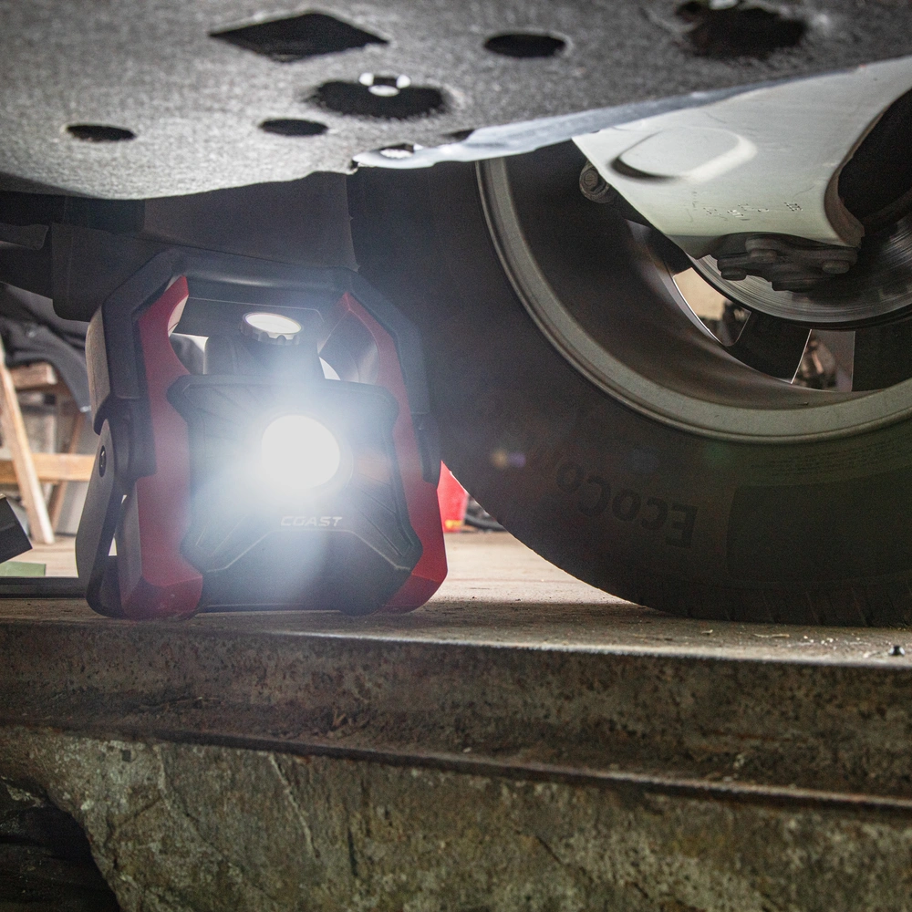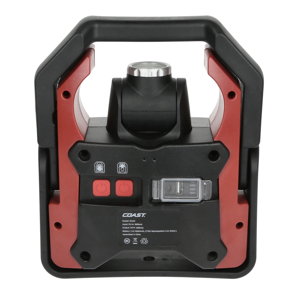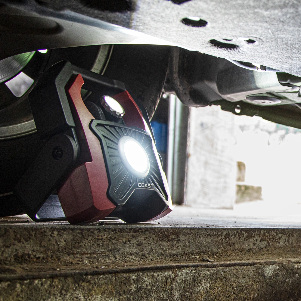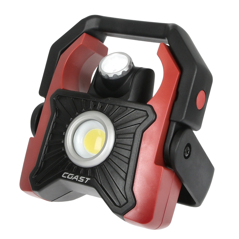 Rechargeable work light with wide-angle flood beam and spot beam. The handle also serves as stand and allows for flexible adjustment of the dust- and splash-proof light. A tripod holder is integrated. The beam can be zoomed in by turning the swivelling spot beam by 180°. The light can also be used as powerbank for external devices.