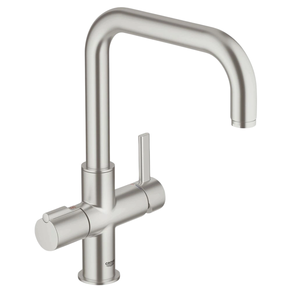 The Red Duo single-lever mixer DN 15 has a separate handle for boiling water and a certified, childproof pull and turn button.
