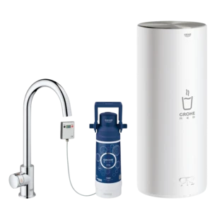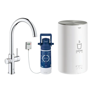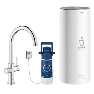 The GROHE Red filter set consists of a filter and a filter head. It is suitable for regions with a water hardness of over 12° German hardness degree. The Red filter set is to be used upstream of a Red boiler.