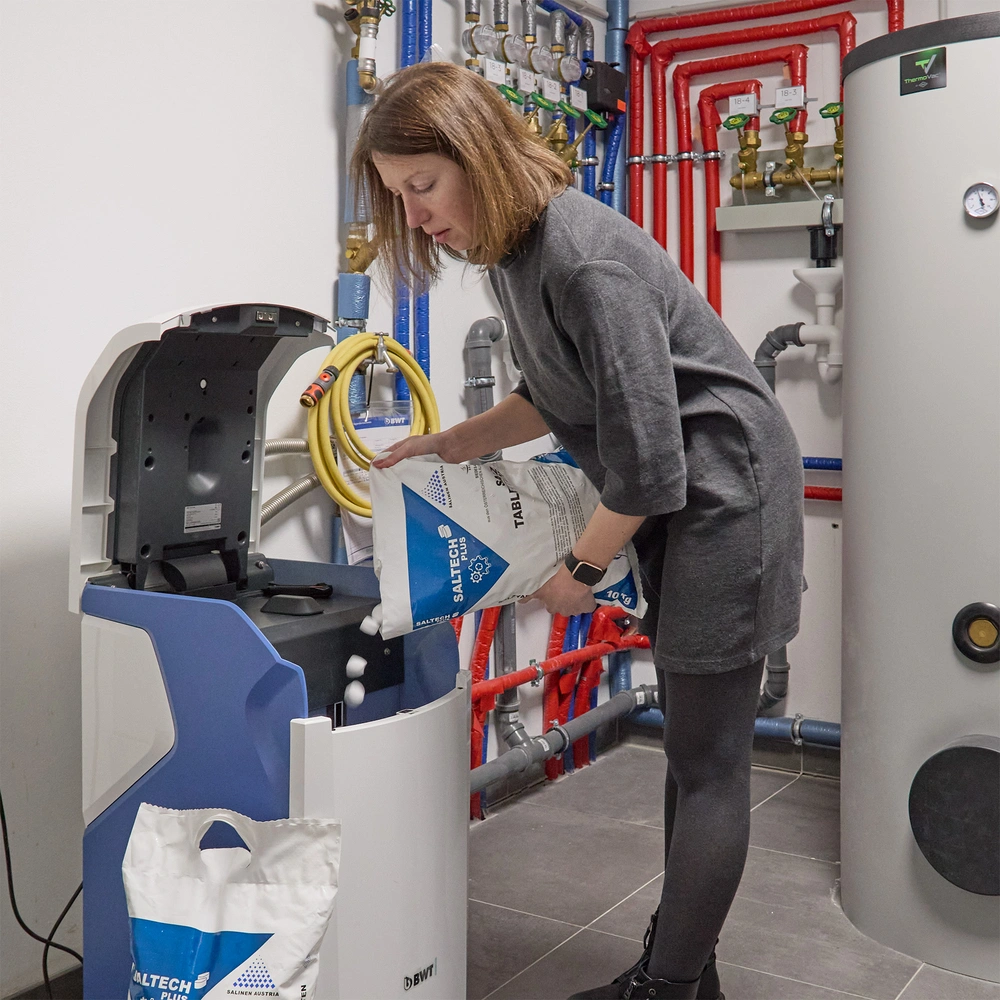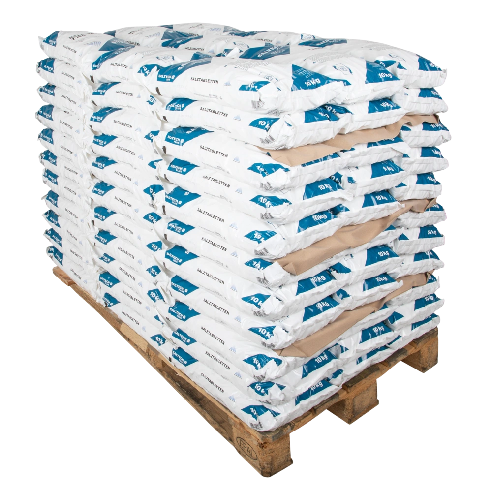 Evaporated salt tablets with at least 99.9% NaCl for the regeneration of water softening systems. The practical 10 kg bags are much easier to carry than the usual 25 kg bags. The small size also makes it easier to fill the soft water system.