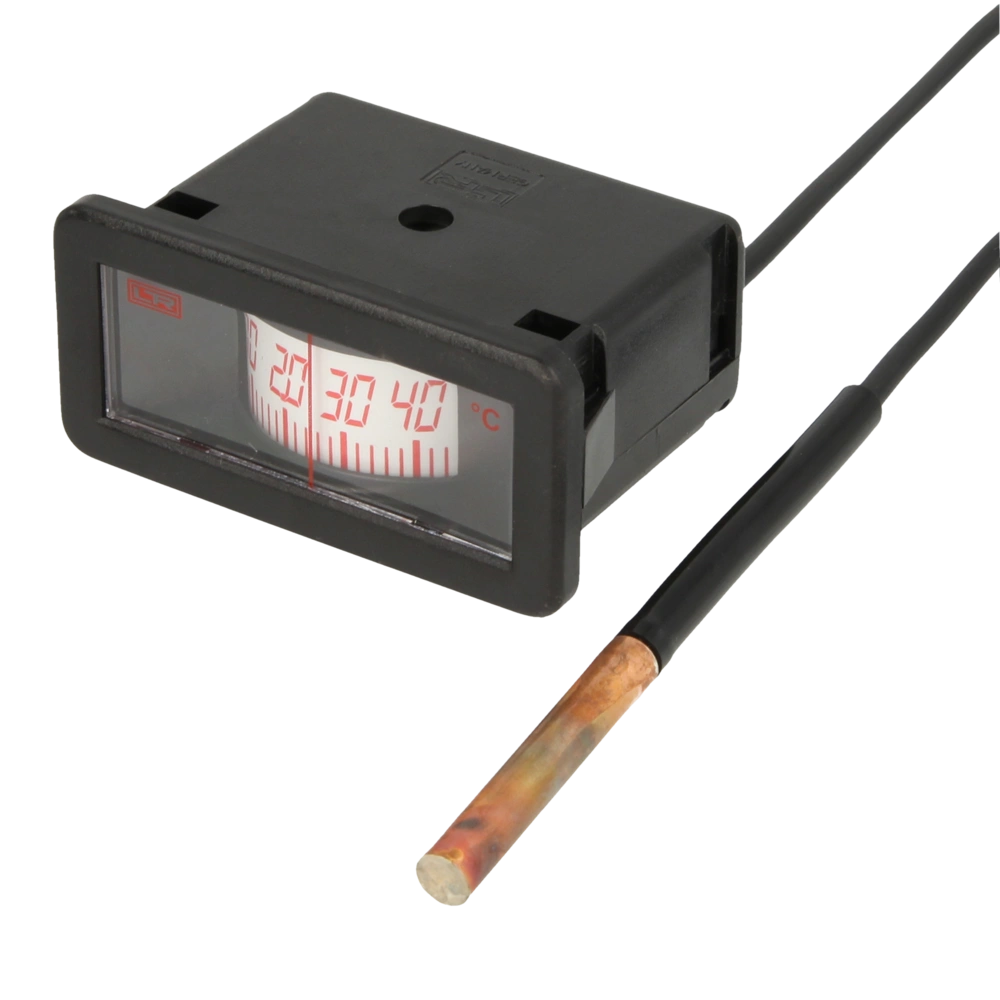 For heating boilers, burner fronts, hot water storage tanks as well as refrigeration or air-conditioning systems, this remote thermometer provides a temperature display directly on the unit. Installed horizontally into a suitable recess in the front panel, the flow or boiler temperature can be read directly at the operating point. The sensor can be flexibly positioned via the capillary tube without any additional power supply. Front mounting using snap-in clips makes installation easier and ensures a secure fit.