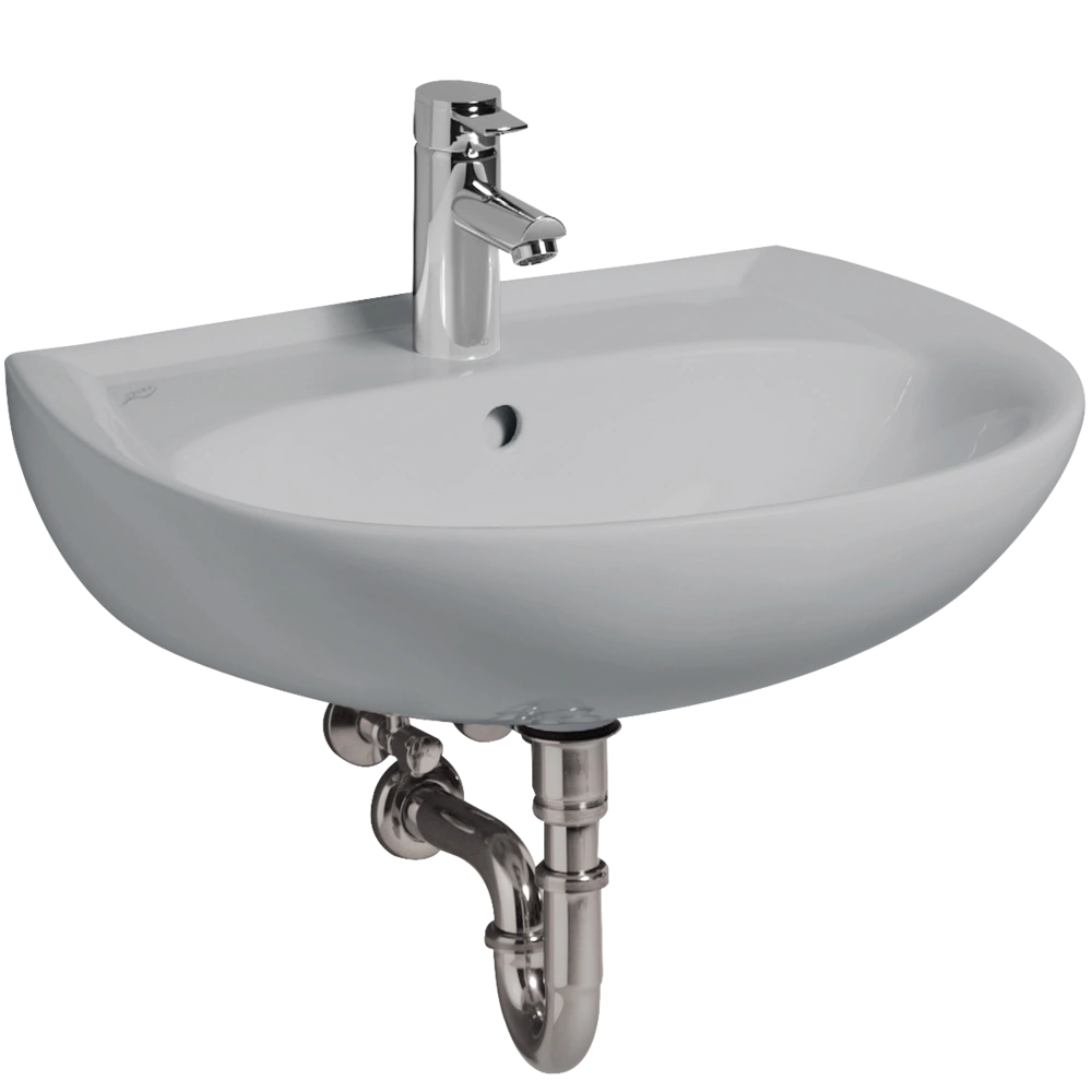 All product informationOval washbasin made of sanitary ware for wall mounting with round overflow, central tap hole and water rail. The washbasin provides a large installation clearance in the mounting space and can be optionally equipped with a half-pedestal.