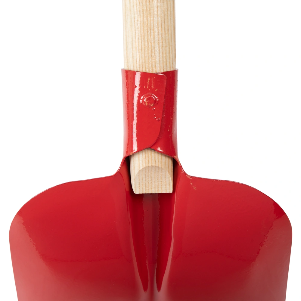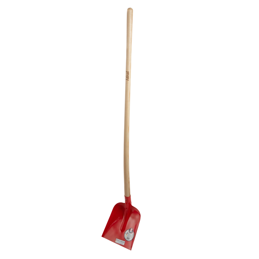 Professional shovel with specially tempered blade. Particularly suitable for picking up loose material such as sand or soil from solid ground. The shaft socket has been welded in an overlapping way and is additionally reinforced for heavy loads. Thanks to the ergonomically shaped long ash shaft, the body posture is back-friendly.
