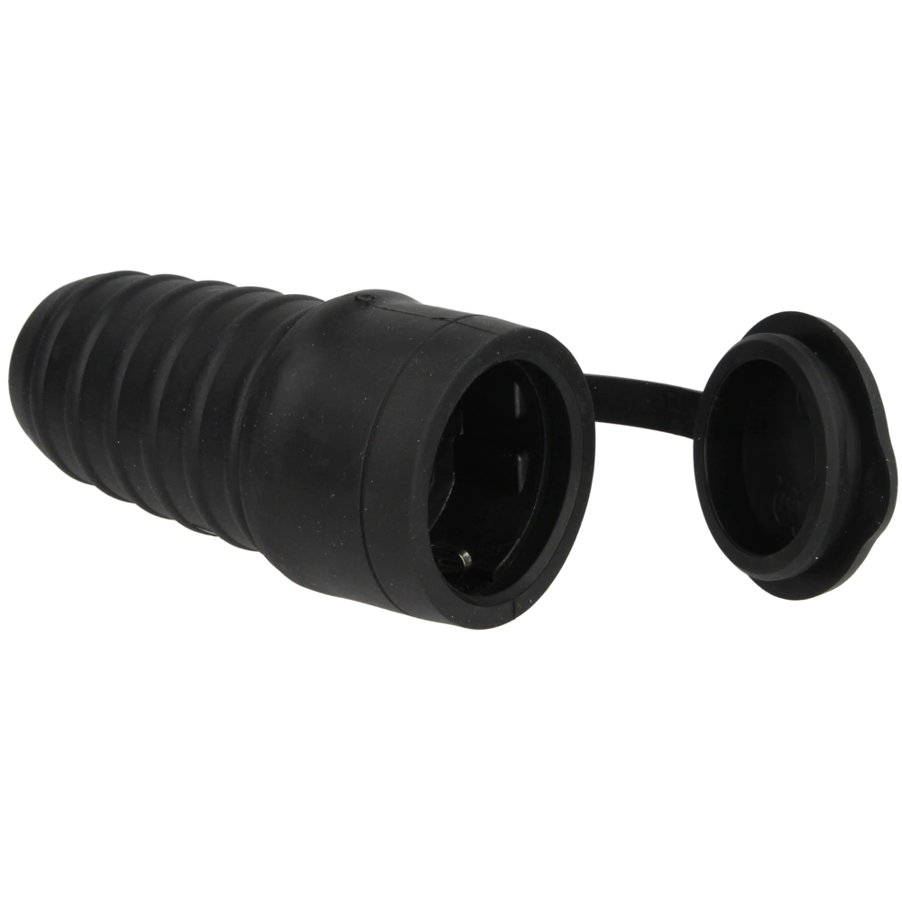 All product informationThe robust rubber safety connector with protective earth contact is equipped with a high-quality insert and a hinged lid.