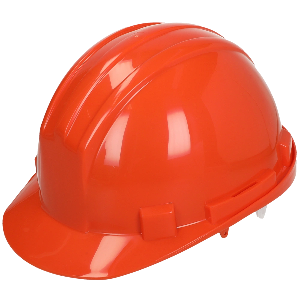 The plastic safety helmet with rain gutter has a 6-point harness with highly tear-resistant fabric tapes. The helmet seat is infinitely and easily adjustable by a rotary wheel.