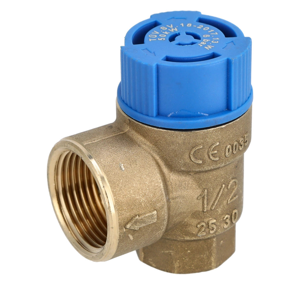 Safety relief valve for closed drinking water systems. The opening pressure is preset and secured against unintentional maladjustment. When the relevant pressure value is reached, the valve opens, and by pressure relief, it prevents the system pressure from rising to dangerous limit values.