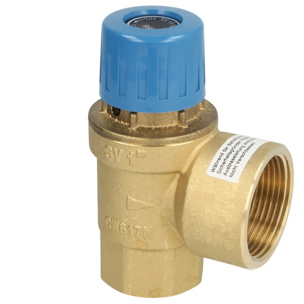 Safety relief valve for closed drinking water systems. The response pressure is preset and secured against maladjustment. When the specified pressure value is reached, the valve opens and prevents the system pressure from rising to dangerous levels by releasing the pressure.
