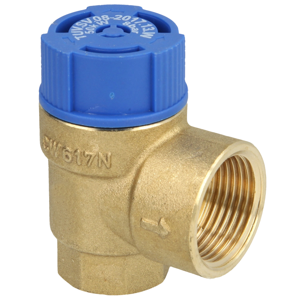 Safety valve for closed drinking water systems. The opening pressure is preset and secured against unintentional maladjustment. When the relevant pressure value is reached, the valve opens, and by pressure relief, it prevents the system pressure from rising to dangerous limit values.