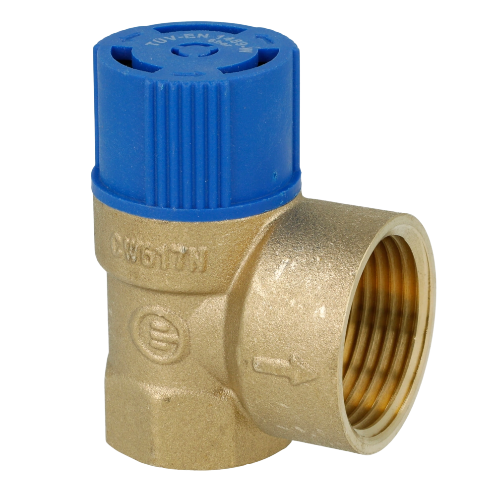 Safety valve for closed potable water systems. The opening pressure is preset and secured against unintentional maladjustment. When the relevant pressure value is reached, the valve opens, and by pressure relief, it prevents the system pressure from rising to dangerous limit values.