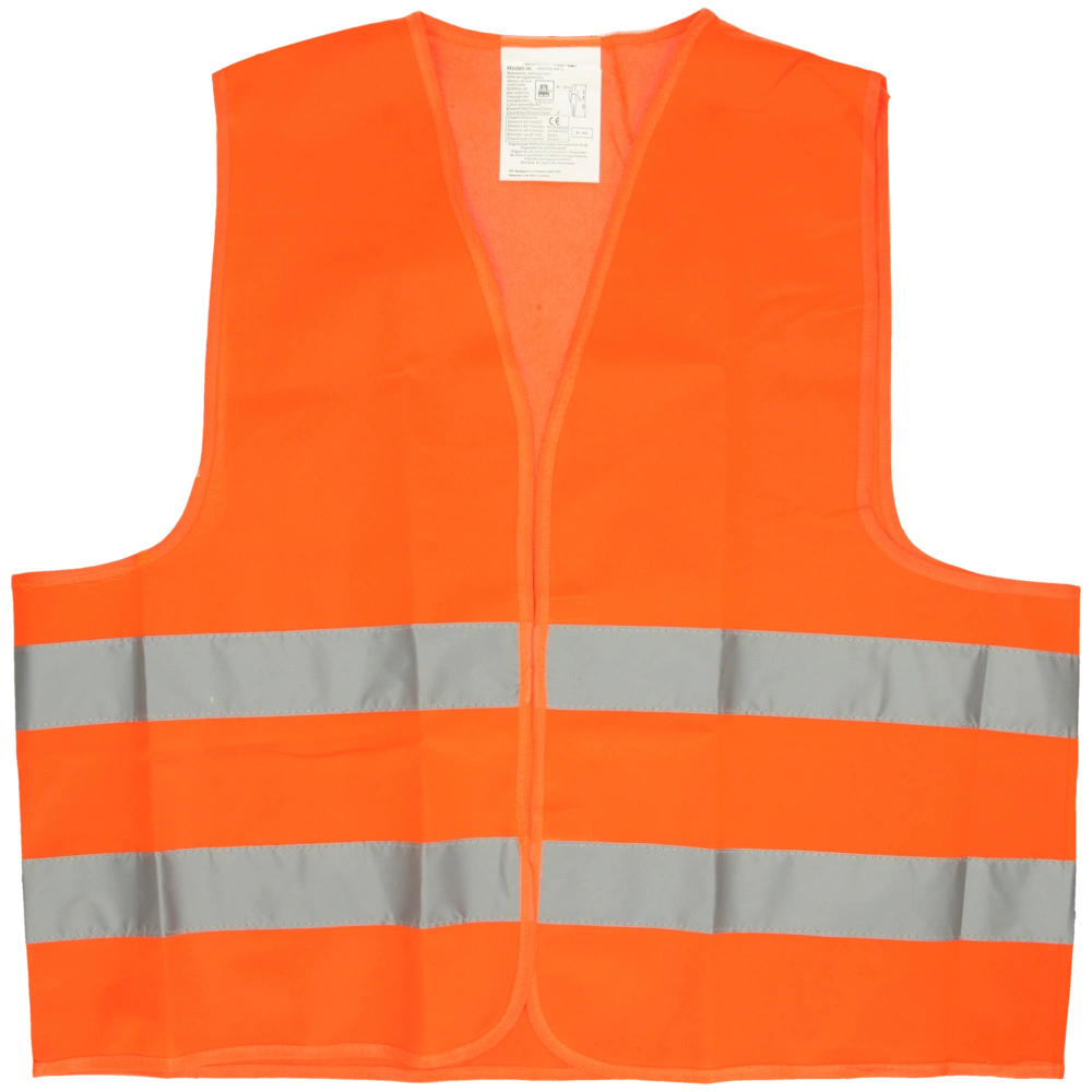 The safety vest in neon orange is made of polyester. It is equipped with two circumferential reflective strips and a velcro fastener.