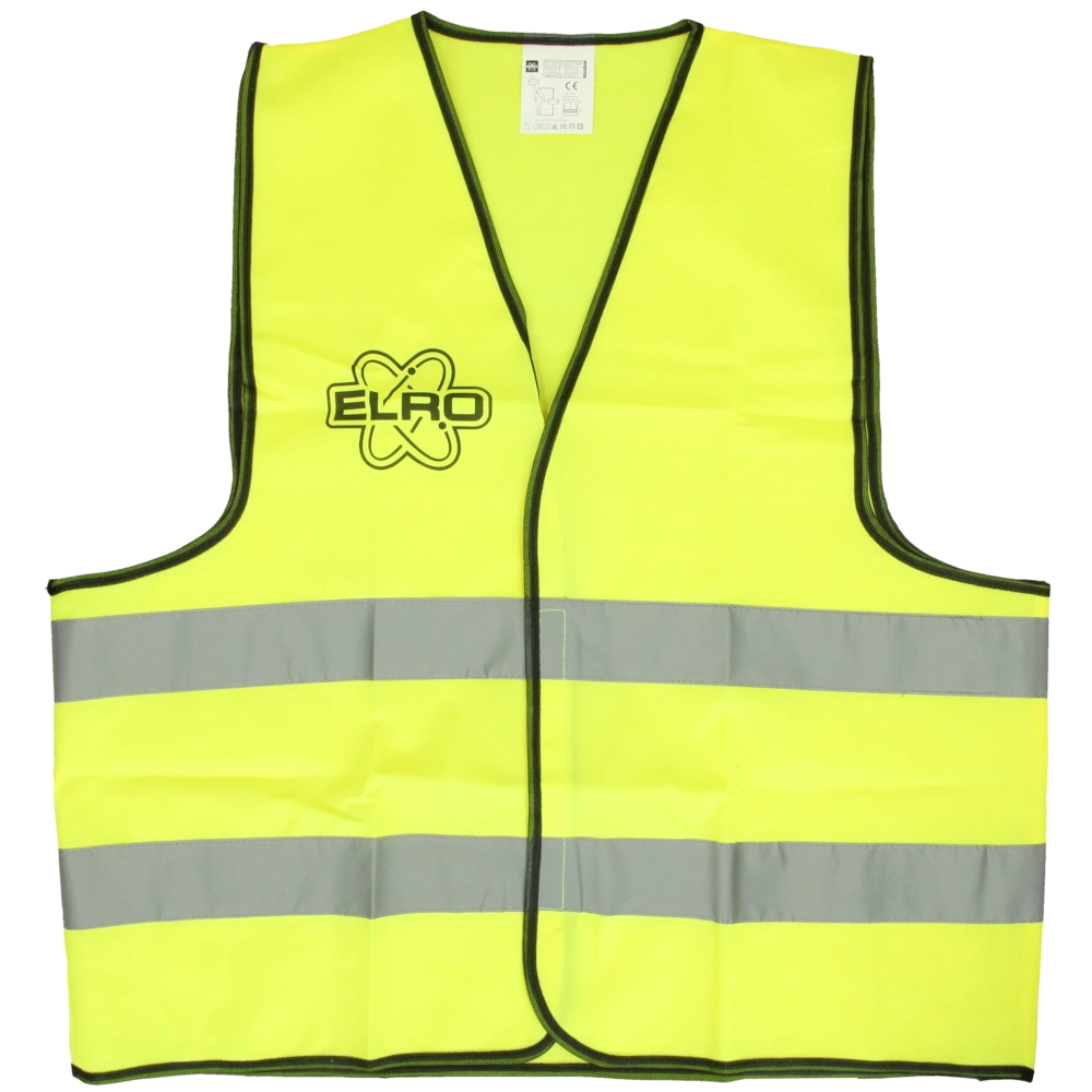 The safety vest in neon yellow is made of polyester. It is equipped with two circumferential reflective strips and a velcro fastener.