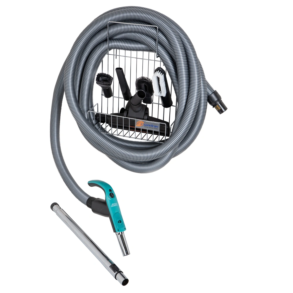 All product information Scope of deliveryExtensive accessory kit for Sanclean central vacuum systems with a 9 m long suction hose with on/off switch, a matching hose protection, a basket for accessories and a telescopic tube. In addition, the kit contains 7 different nozzles for various applications.