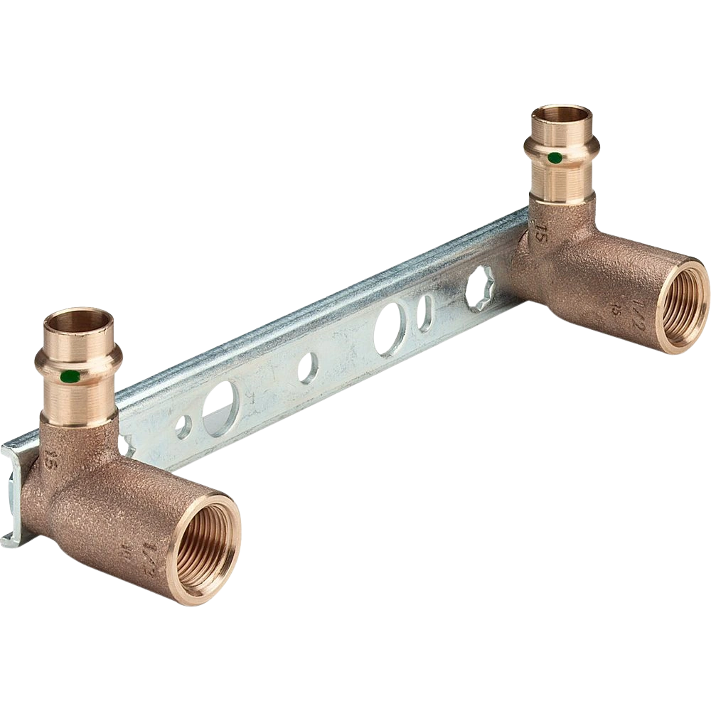 The mounting unit with two wall plate elbows for pressing is used for the connection of tapping points. The press fitting is suitable for sanitary and heating pipes made of copper.