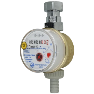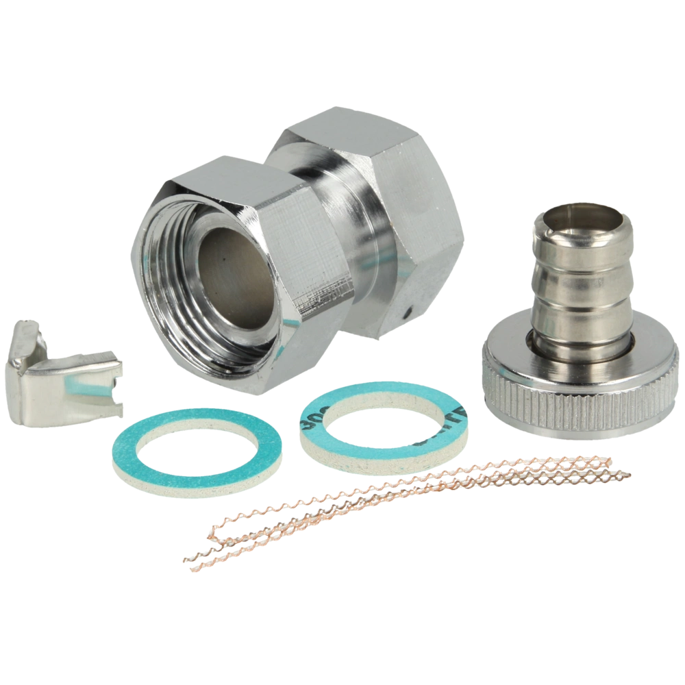 The chromium-plated tap meter screw fitting is a mounting set for the use between tap and withdrawal hose. The screw fitting is lead-sealable.