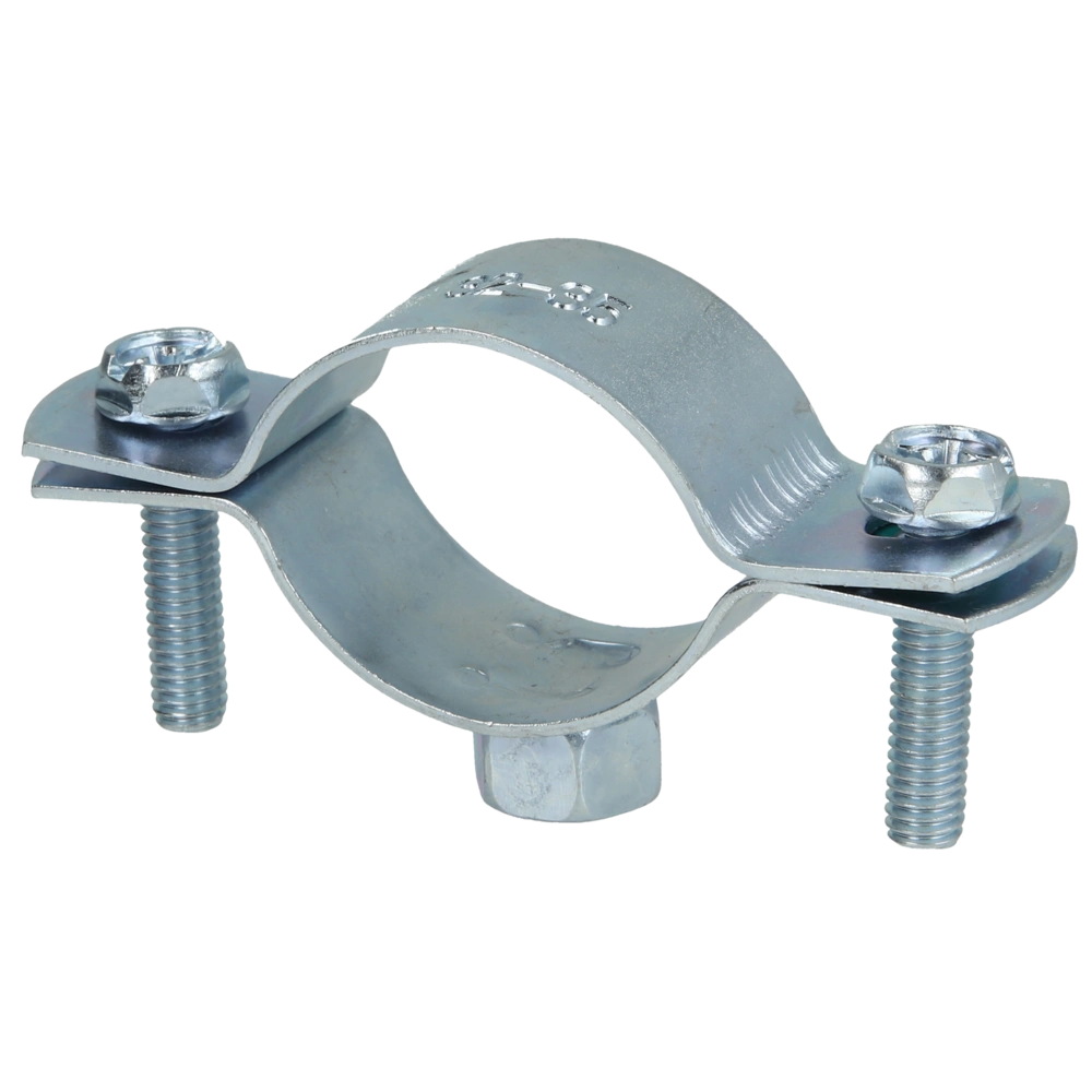 Screw pipe clamp for securing pipes to walls, ceilings and floors. The screw pipe clamp consists of two parts and has a metric thread.