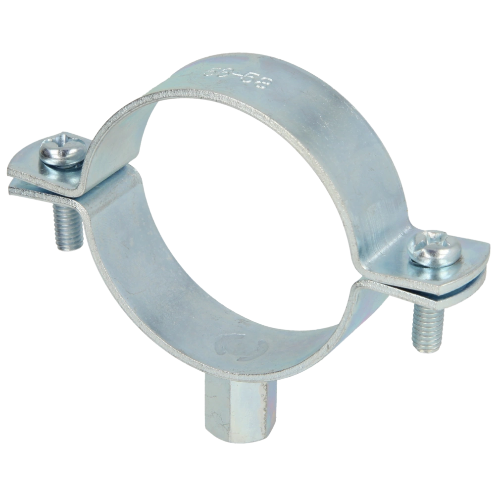Screw pipe clamp for securing pipes to walls, ceilings and floors. The screw pipe clamp consists of two parts and has a metric thread.