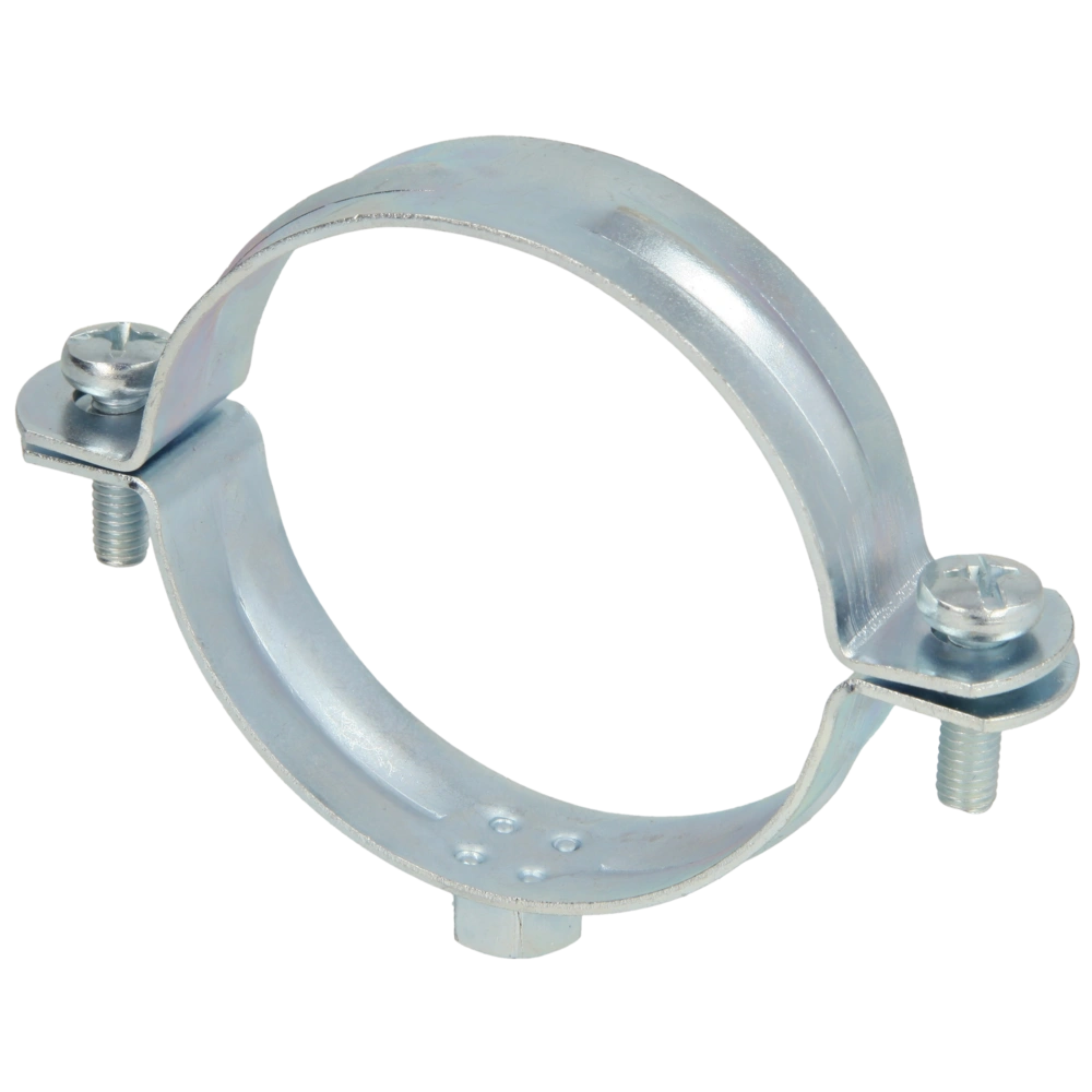 Screw pipe clamp for securing pipes to walls, ceilings and floors. The screw pipe clamp consists of two parts and has a metric thread.