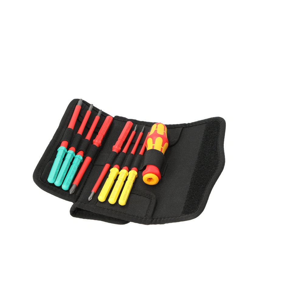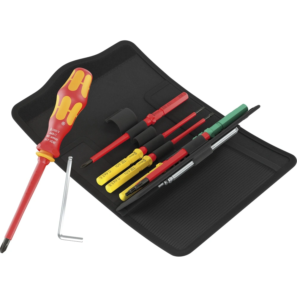 Compact VDE tool set with interchangeable blades and hex keys for flexible use.