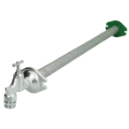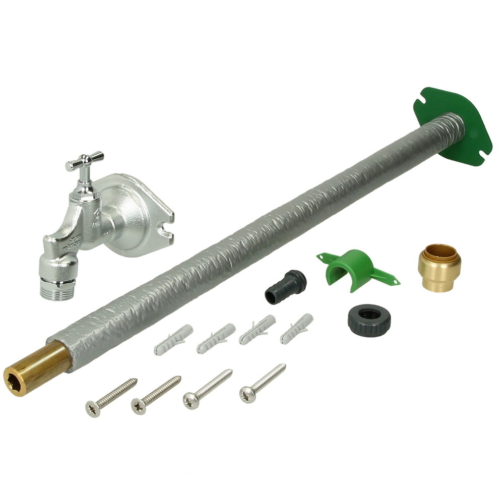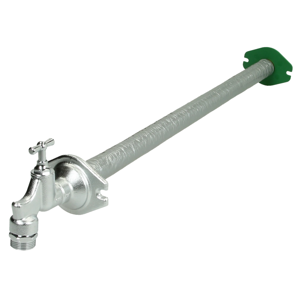 The outdoor valve with backflow-preventer and pipe vent can be used in new buildings or for retrofitting in already existing houses with wall thicknesses of 135 to 500 mm. Draining the pipe is not required any more.