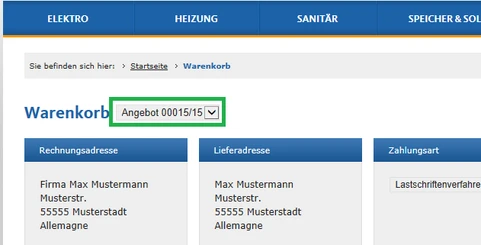 Then the webshop opens and the selected articles should have been added or updated in an existing or in a new shopping cart. The currently selected shopping cart can be identified by the following dropdown.