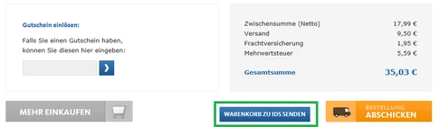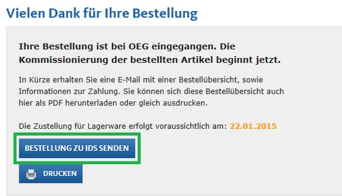 You should now land directly on the shopping cart page in the OEG webshop. There appears, if you have items in the shopping cart, now under the shopping cart the button "SEND GOODS TO IDS".