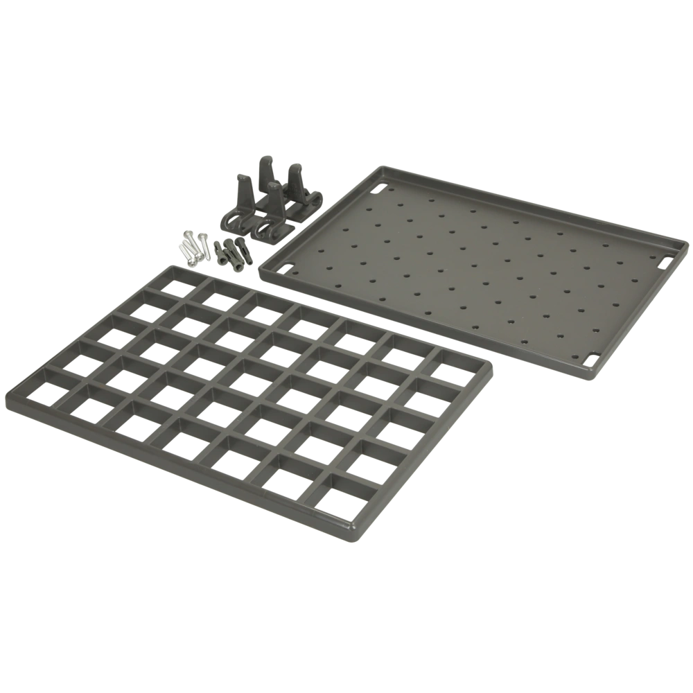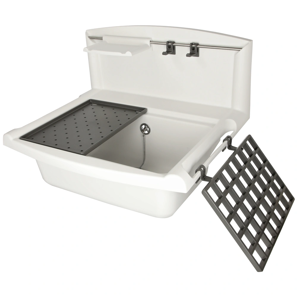All product information Scope of deliveryThe shelf set is the perfect addition to the utility sink Multiset. It comprises a drip tray, a support rack and 4 hooks to be attached to the rail or as towel holders on the side.