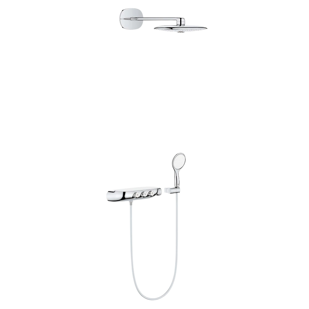 The GROHE SmartControl shower system with thermostatic mixer has a head shower with horizontal shower arm, which can be individually aligned when first mounted. The hand shower has a spray plate in moon white...
