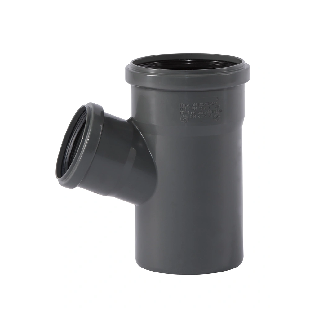 HT single branch made of flame-retardant PP-H as per DIN 4102 (B1) with two plug-in sockets and 3-lip seals for wastewater pipes within buildings as per DIN EN 1451. The branch is suitable for hot, cold and aggressive media as well as for central vacuum cleaning systems.