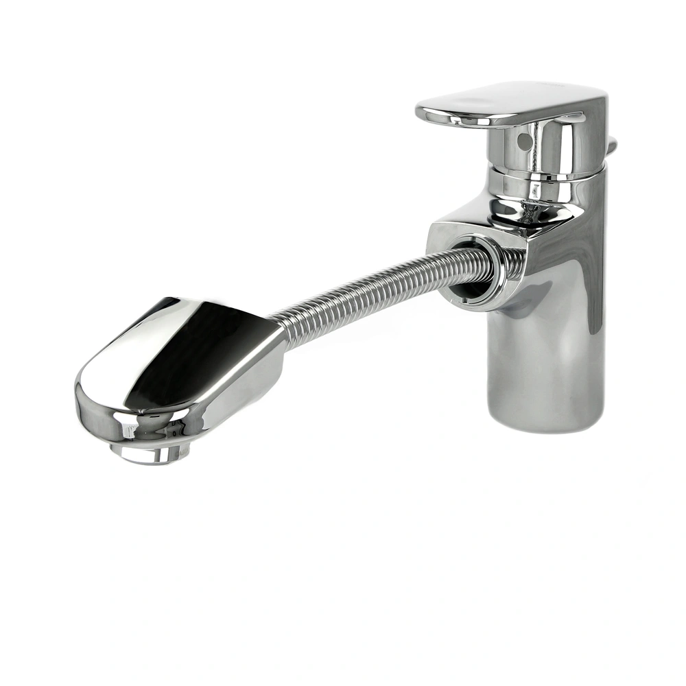 All product information Scope of deliveryThe single-lever basin mixer has a pull-out spout with SpeedClean mousseur, an integrated non-return valve and flexible connection hoses. A temperature limiter and an adjustable flow rate limiter are also included.